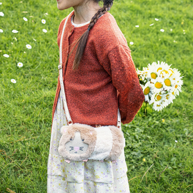 Tasken er lavet af det blødeste imiterede pels og har form som et marsvin med broderet snude og små poter lavet af genanvendt polyurethan, hvilket gør den både stilfuld og miljøvenlig.