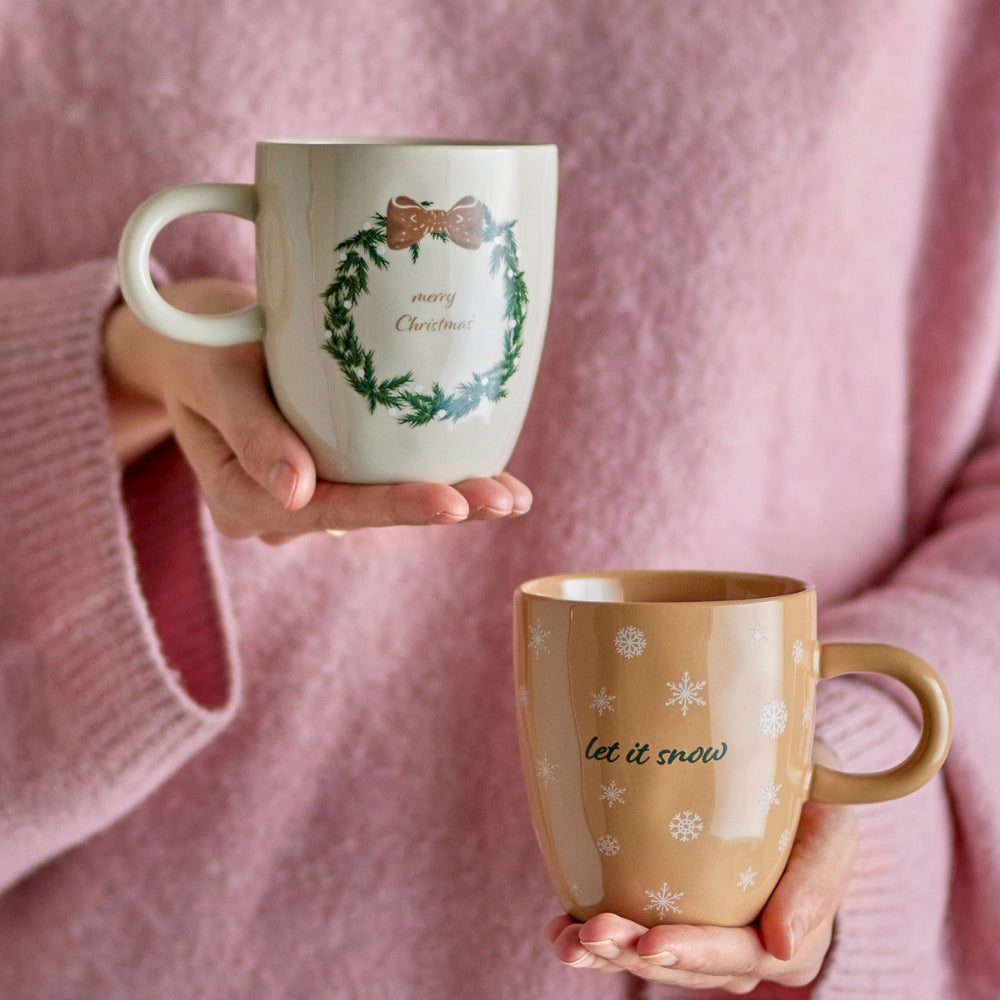 Sættet indeholder to kaffekrus i stentøj, dekoreret med yndige motiver – det ene med ordene 'Let it snow' omgivet af snefnug, og det andet med en klassisk krans med ordene 'Merry Christmas'.