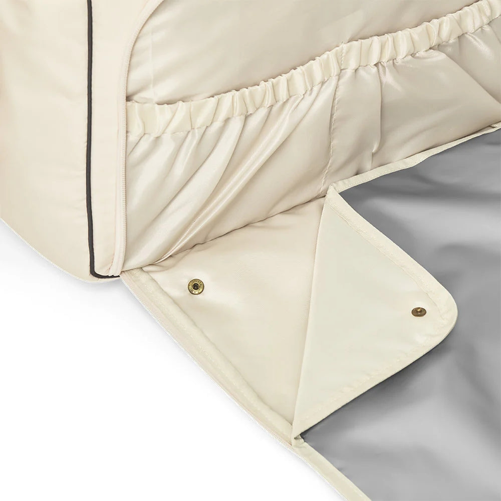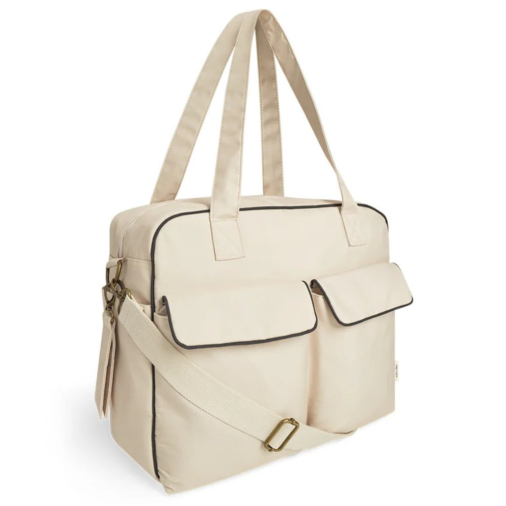 Den leveres også med en puslemåtte, der er placeret i en stor udvendig lomme, som let kan tages af og fjernes, så der bliver ekstra plads til andre ting. Tasken har rummelige rum indvendigt, herunder en dobbelt lomme med termofoer, der er ideel til opbevaring af mælkeflasker eller drikkevarer.