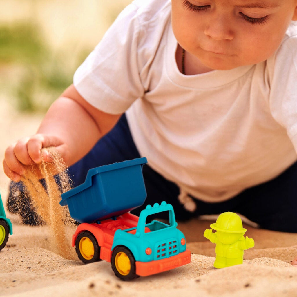 Lastbilerne fungerer godt både indendørs og udendørs – i haven, parken, sandkassen, på en tur eller på stranden.