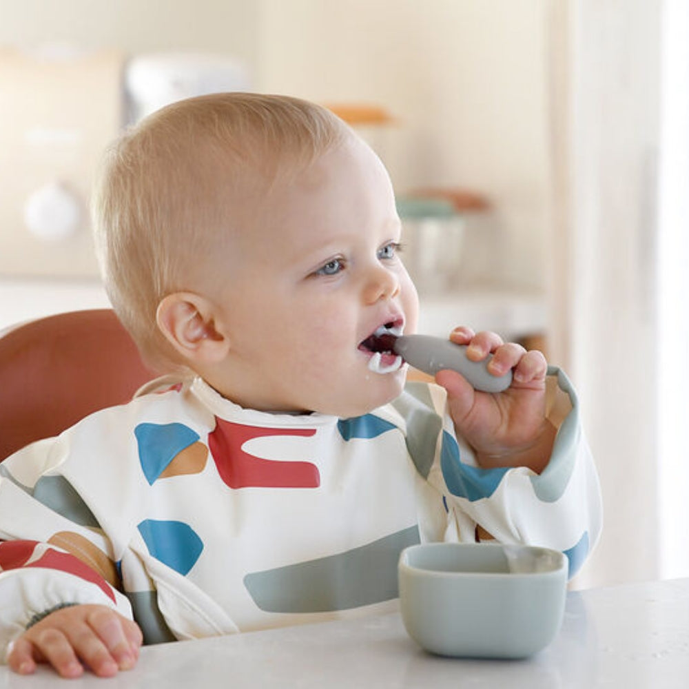 Et sæt innovative, ergonomiske første bestik, der er udviklet i samarbejde med børneernæringseksperter for at støtte småbørns udvikling og uafhængighed.