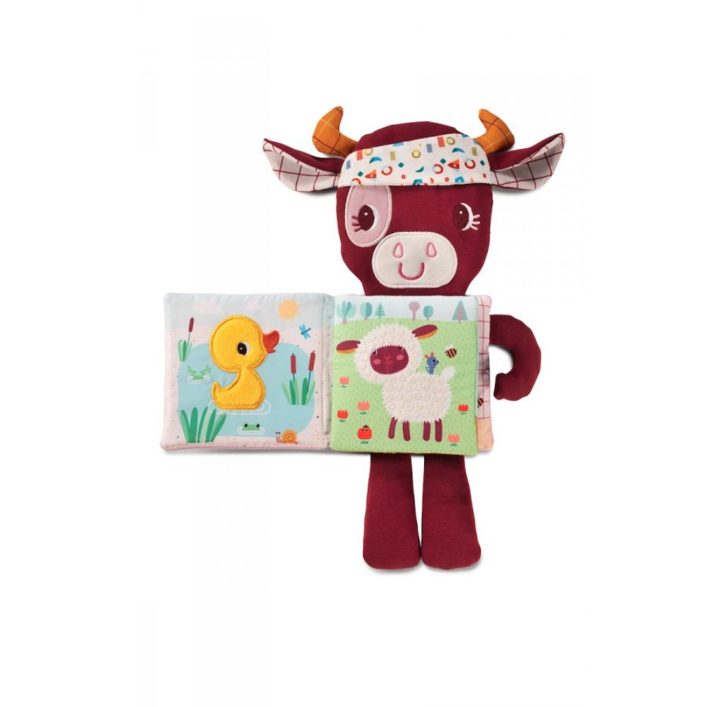 Koen holder en blød bog i sine poter, hvor siderne viser dyr fra gården.