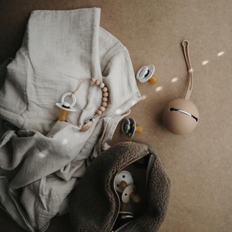 Mushie Ball Blush Stroller Pacifier Case har en speciel fastgørelsesmekanisme, som gør det muligt at fastgøre den til barnevognen, barnesengen eller andre steder.