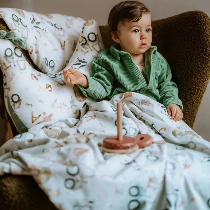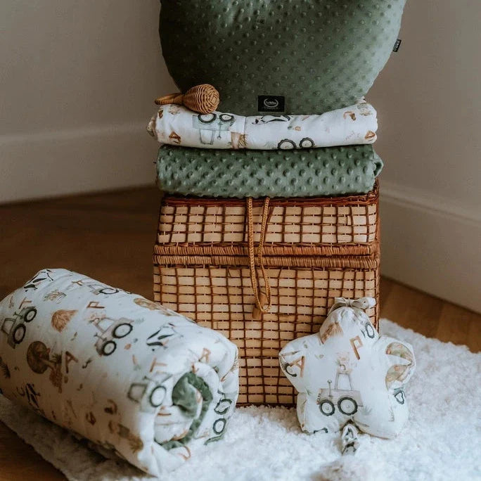 Et sengetøjssæt til babyer i størrelse M med ABC Farm-mønster fra La Millou.
