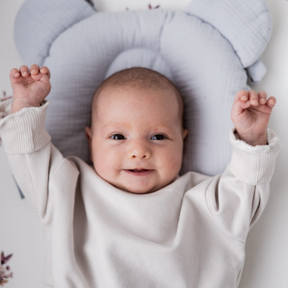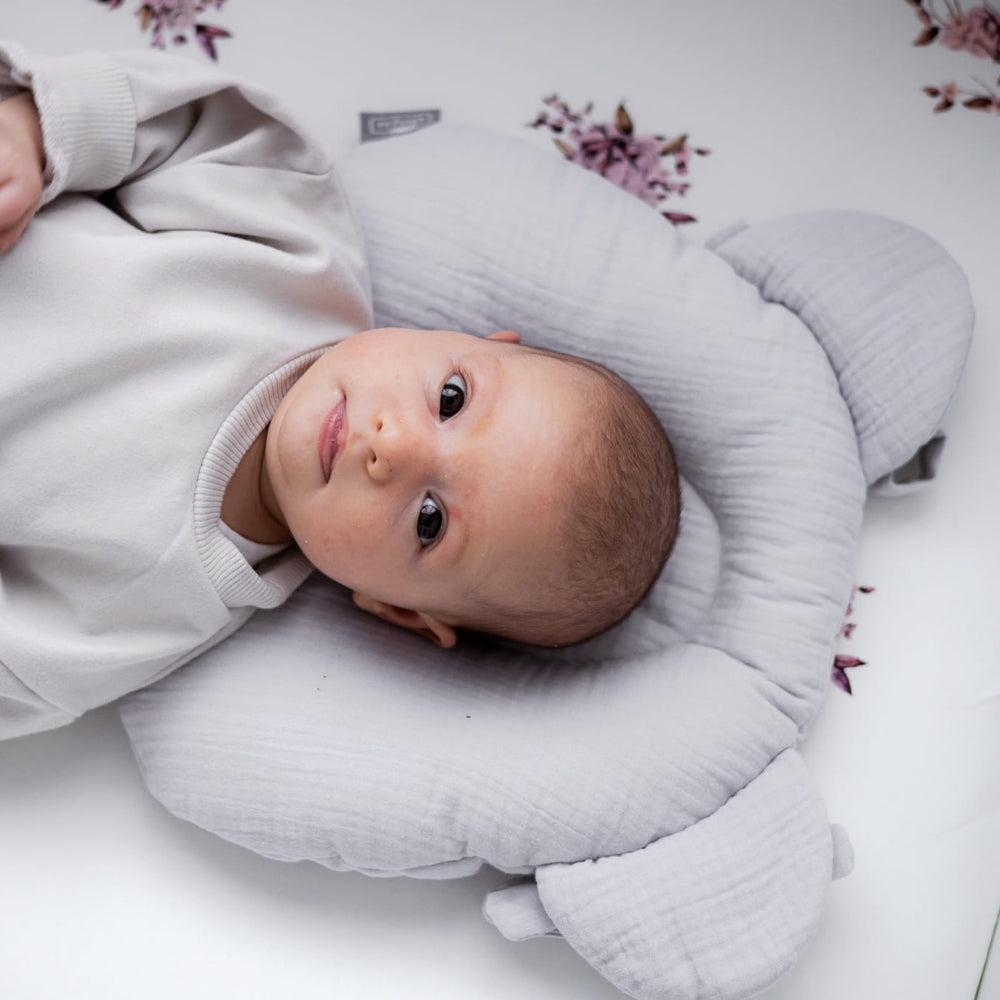 En pude med en fordybning hjælper med at undgå problemet med flade hoveder hos babyer.