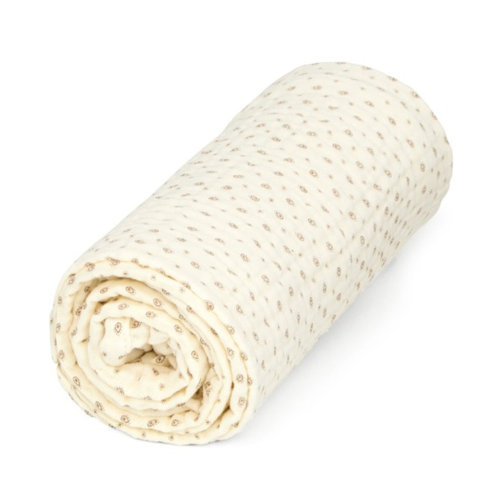 Bomulds-tæppet er lavet af 4 lag luftigt, GOTS-certificeret økologisk bomuld, hvilket gør det blødt mod huden og behageligt at røre ved.