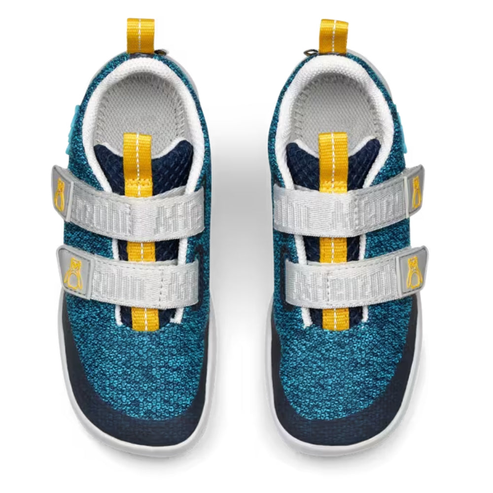 Modellen tiltrækker opmærksomhed med sin intense blå farve, kontrastfulde lyse velcrostropper og gule løkker, der gør skoene nemme at tage på.