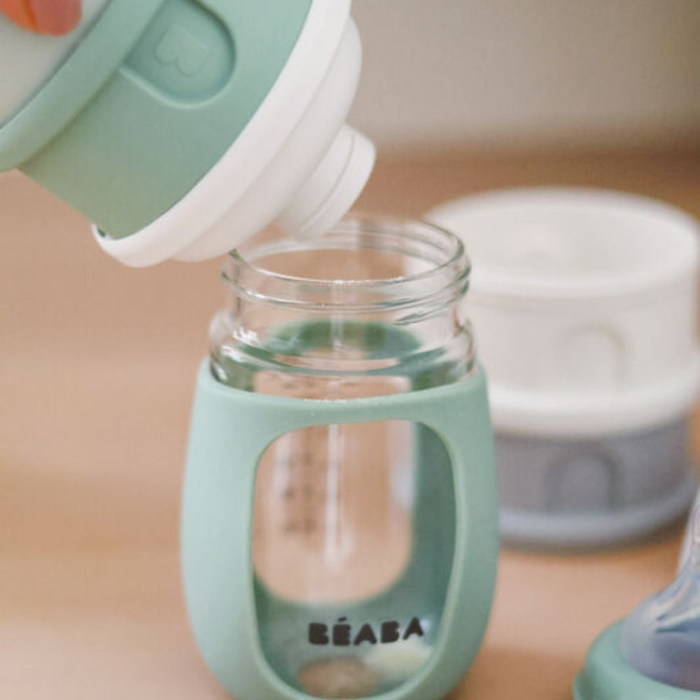 De bomulds-hvide/salviegrønne mælkepulverbeholdere er et yderst praktisk, kompakt sæt med 4 mælkepulverbeholdere fra Beaba.