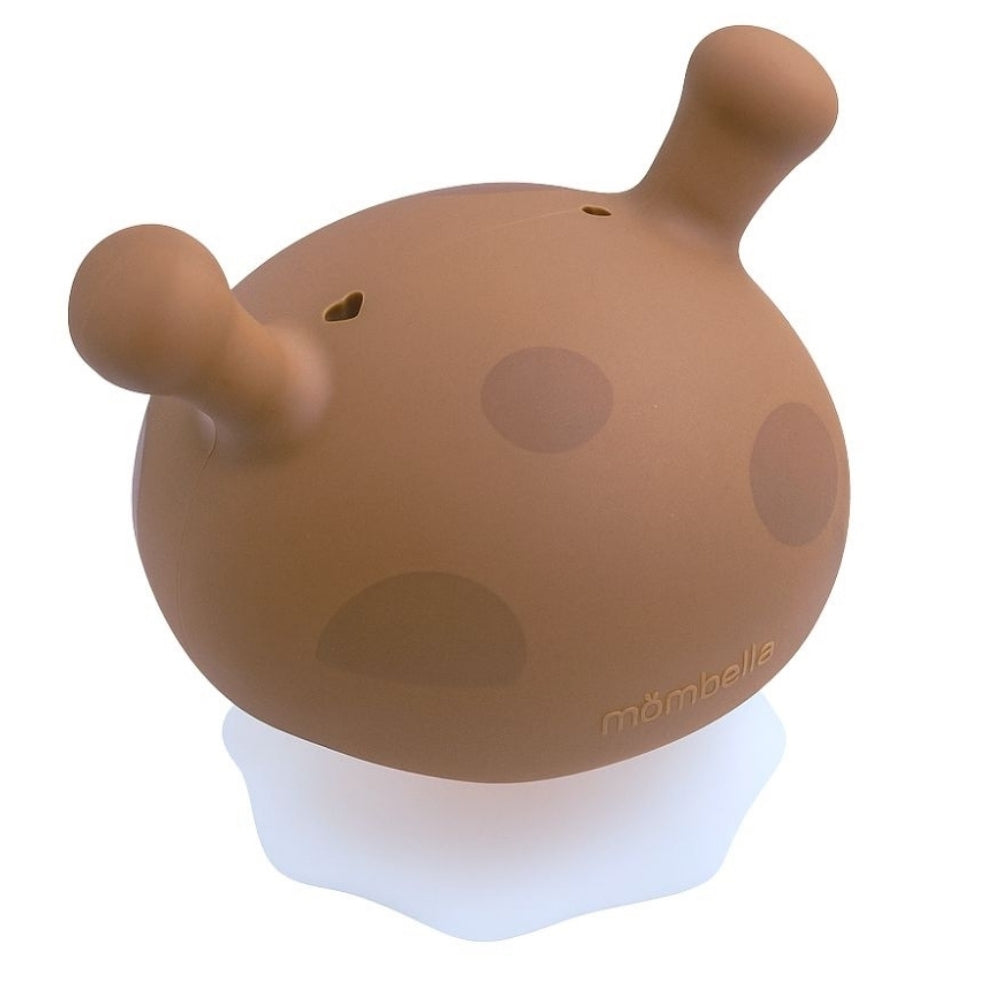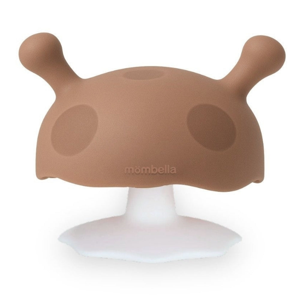 Mombella Mushroom Mocha Loca-bidring er en omhyggeligt designet bidring til babyer, der kombinerer en beroligende funktion med sikker, sensorisk leg.