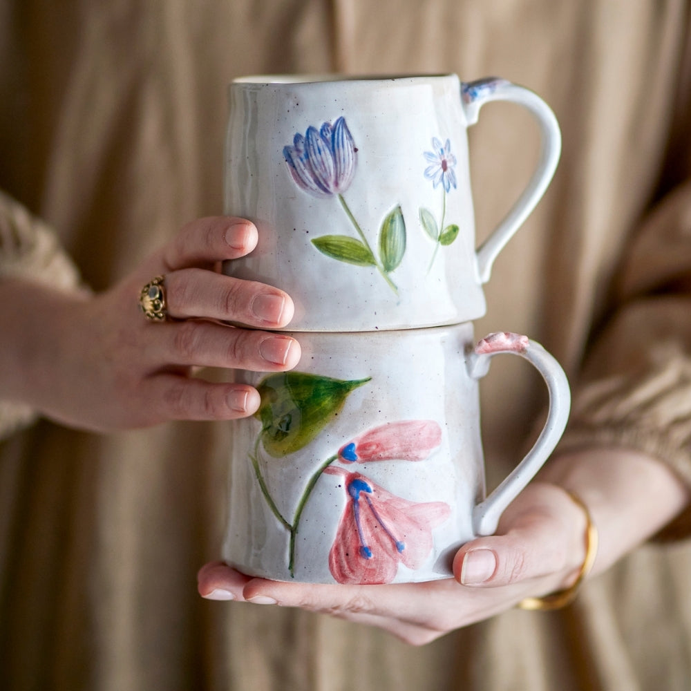 Dette unikke sæt med to krus imponerer med sit subtile beige farveskema med delikate pletter og blomsterdetaljer i dæmpede nuancer.