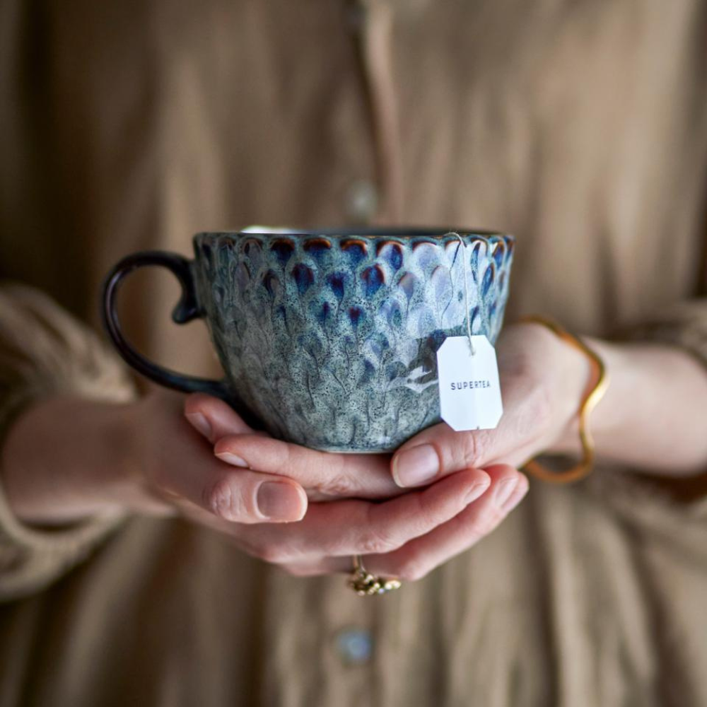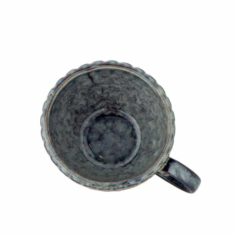 Med en reaktiv glasur har hver kop en unik, let skællet struktur og subtile grå nuancer, der fremhæves ved kanterne.
