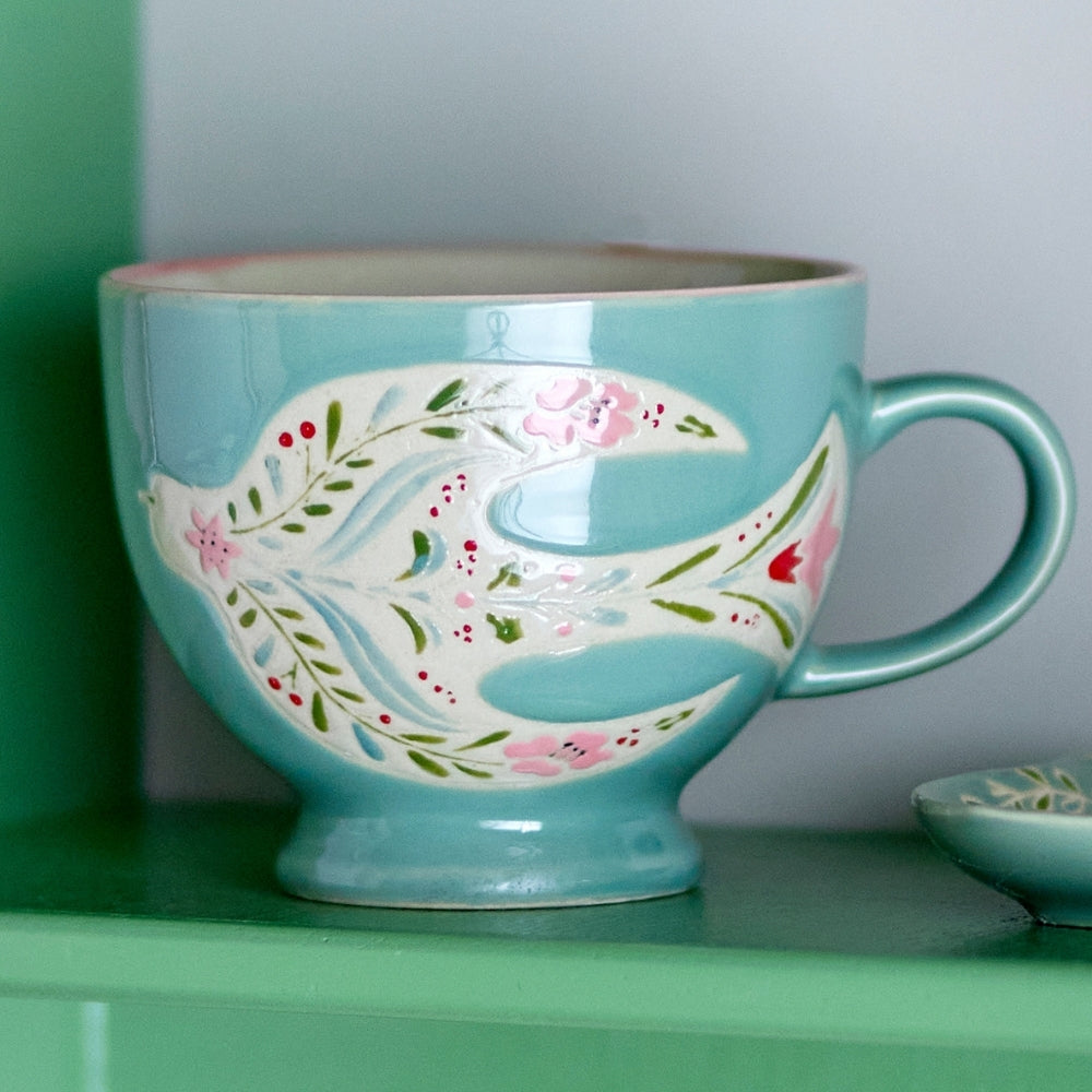 Den let udsvungne bund og den subtile lyserøde kant tilføjer lethed og elegance, mens de håndmalede motiver af fugle, blomster og blade fanger øjet.