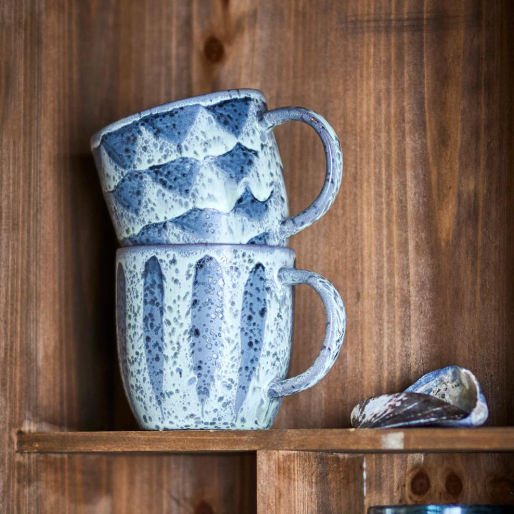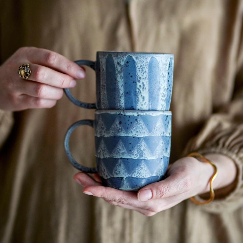 Hvert krus er færdiggjort med en reaktiv glasur og håndmalede detaljer, så de naturlige variationer i mønster og farveintensitet gør hvert stykke unikt.