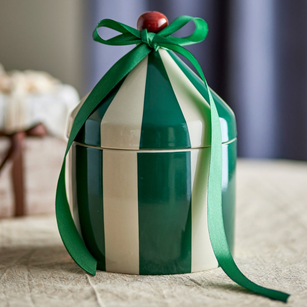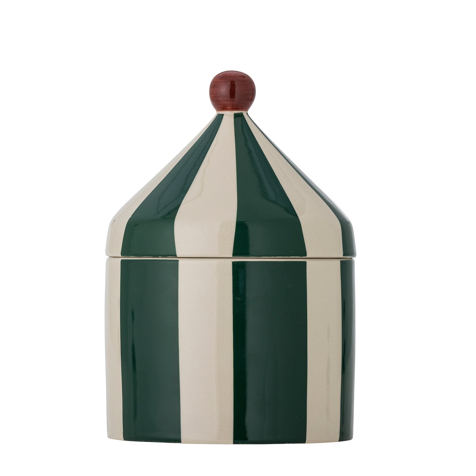 Opbevaringsbeholderen har den søde form af et cirkustelt og er lavet af stentøj med blå og hvide striber.
