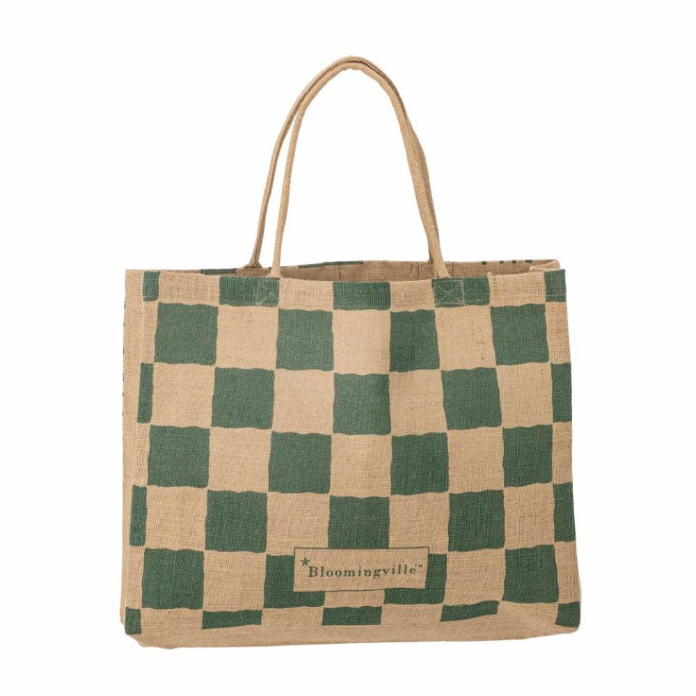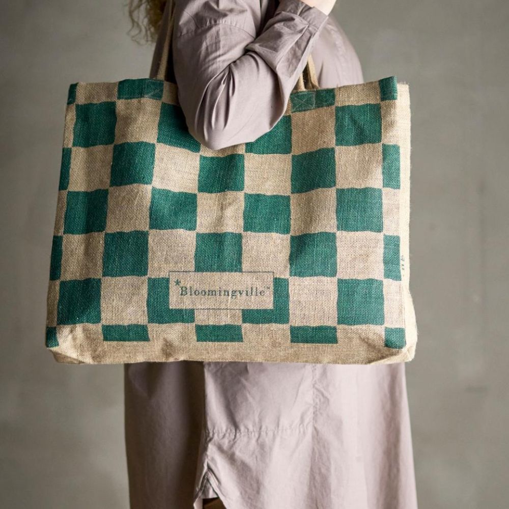 Bloomingville-tasken er lavet af slidstærk jute og har et unikt design – et grønt ternet mønster på den ene side og et elegant grafisk mønster på den anden.
