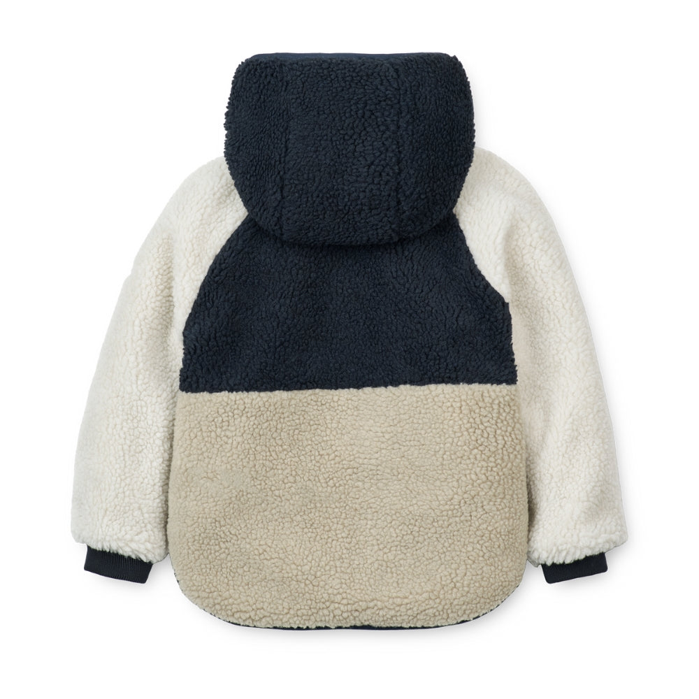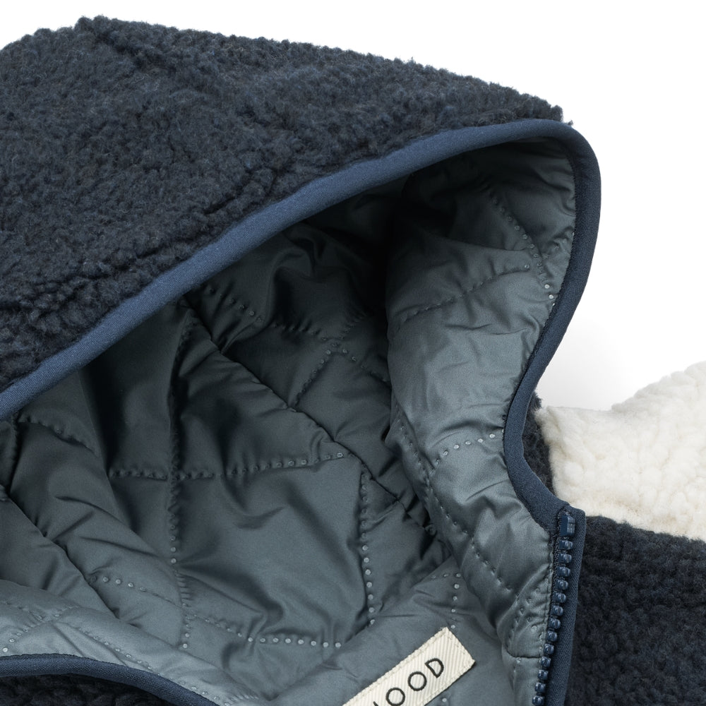 Liewood Jackson-jakken er fremstillet af 100 % genanvendt polyester og giver varme takket være sit termolag og bløde plysfor, samtidig med at den er let og behagelig at have på.