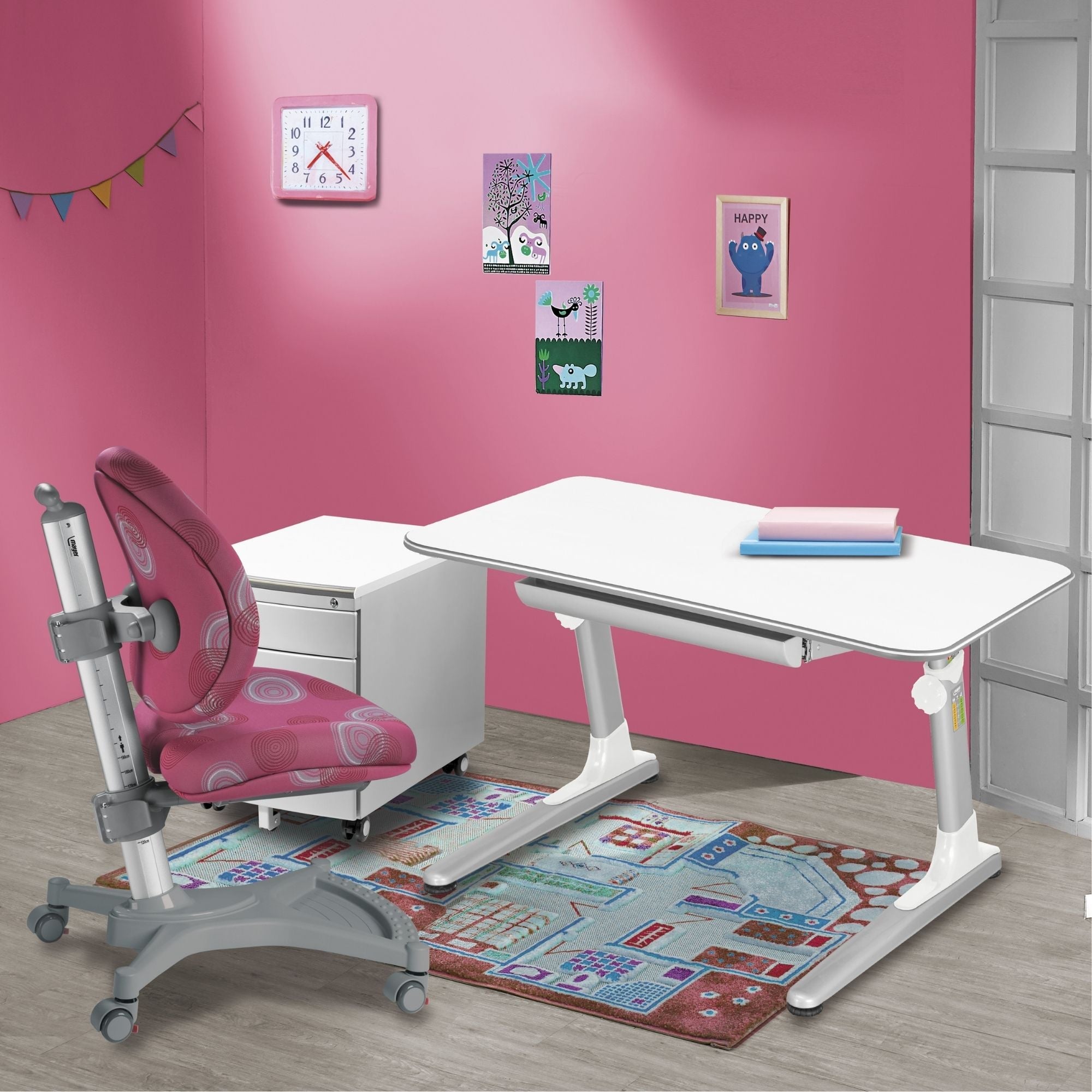 - Ud over de ergonomiske stole og skriveborde tilbyder Mayer yderligere møbler til børneværelset, såsom piedestaler, skrivebordsforlængere og en lampe.