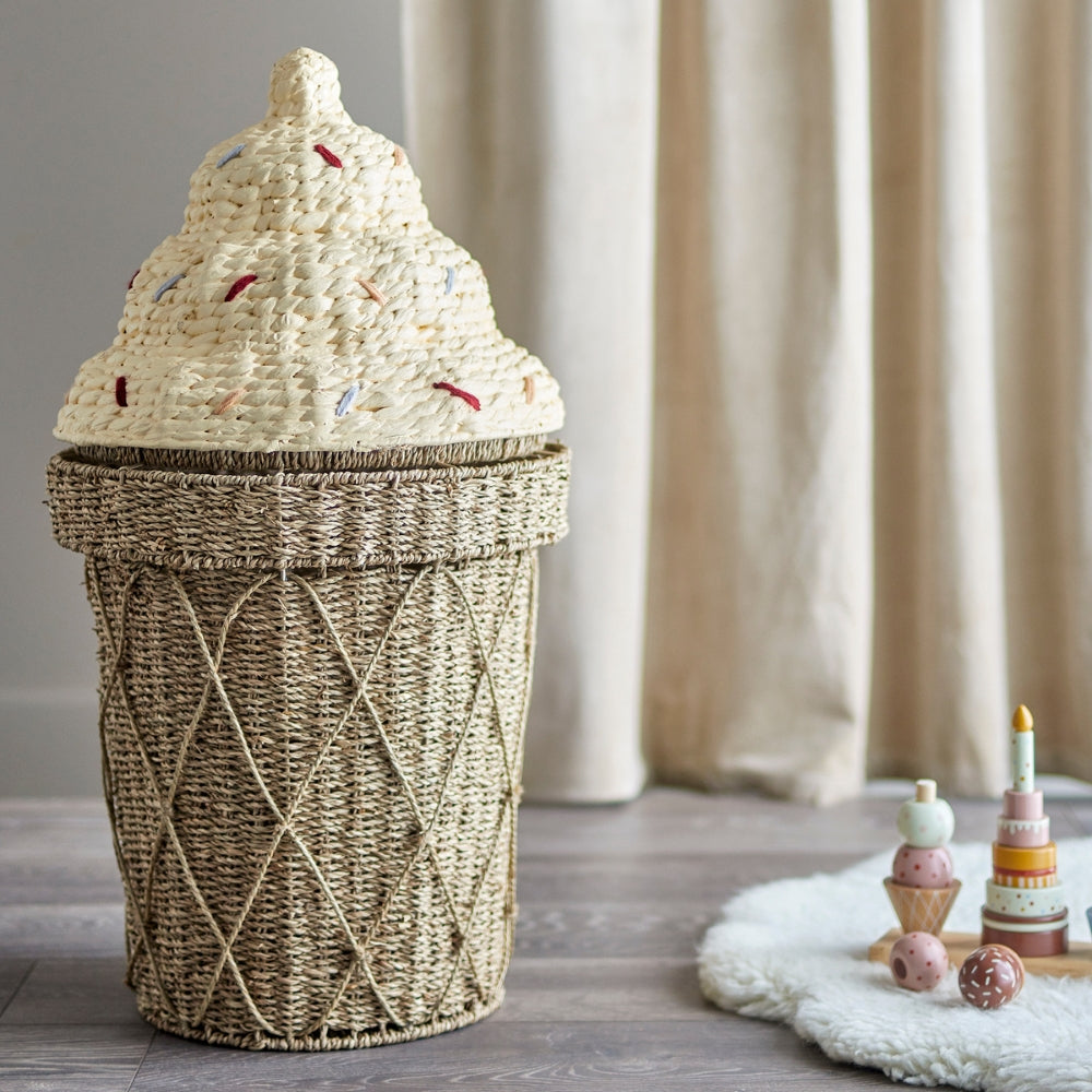 Bloomingville MINI Cillie legetøjskurv med låg ligner en sød isvaffel med krymmel.