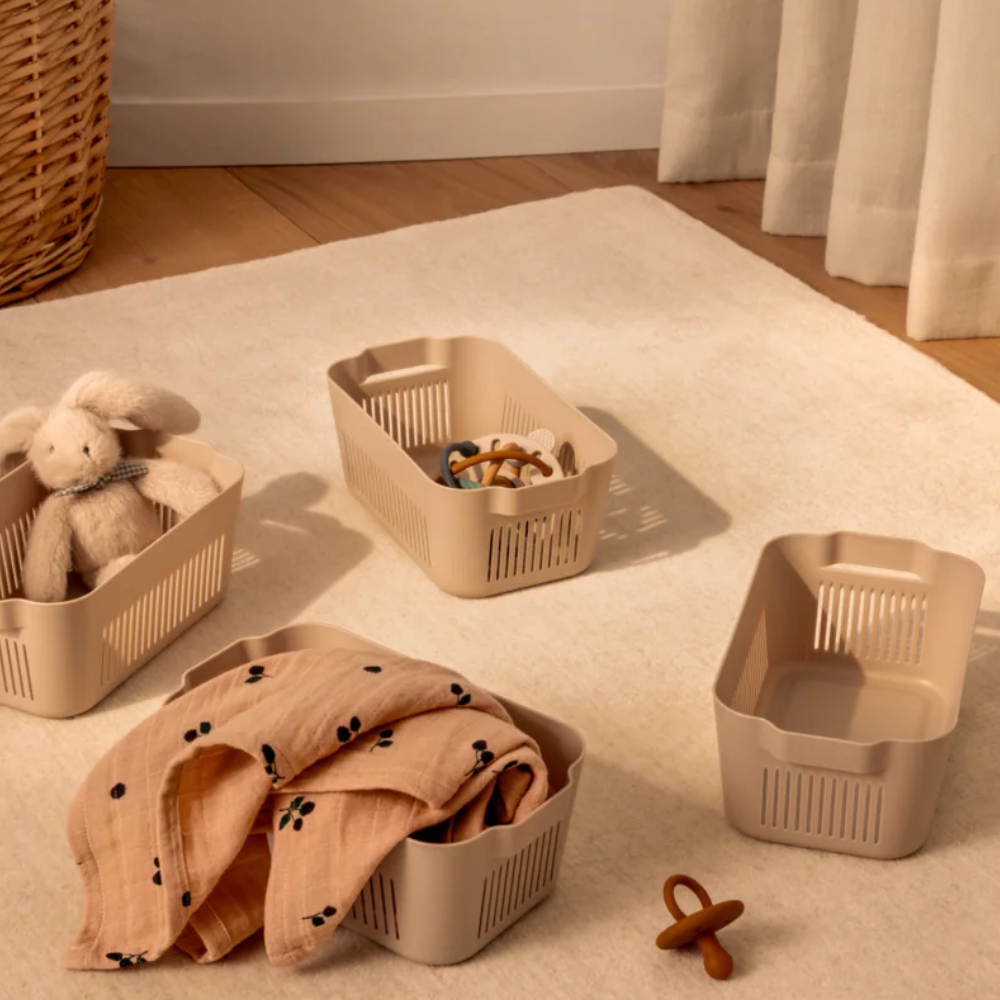 Et sæt kurve hjælper med at samle de små ting: små legetøj, sokker, kunsttilbehør og alle de skatte, som en lillebørn har.
