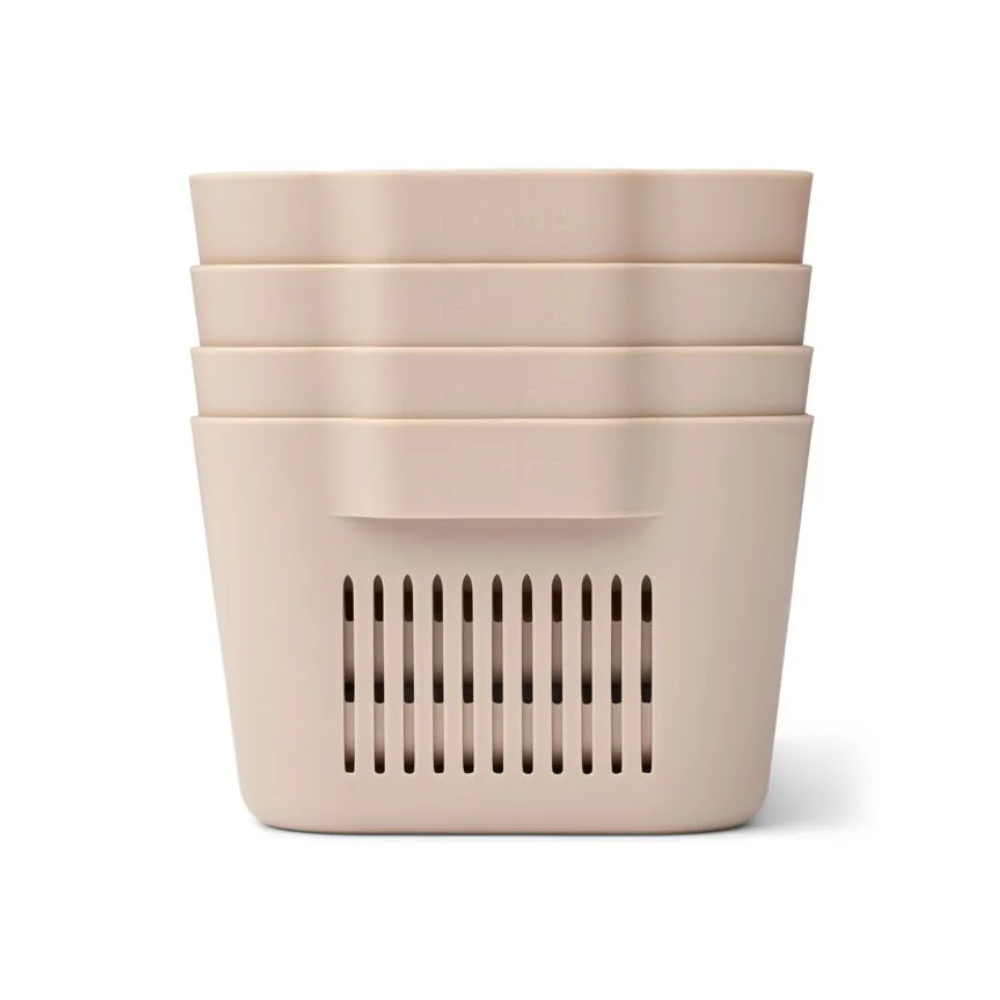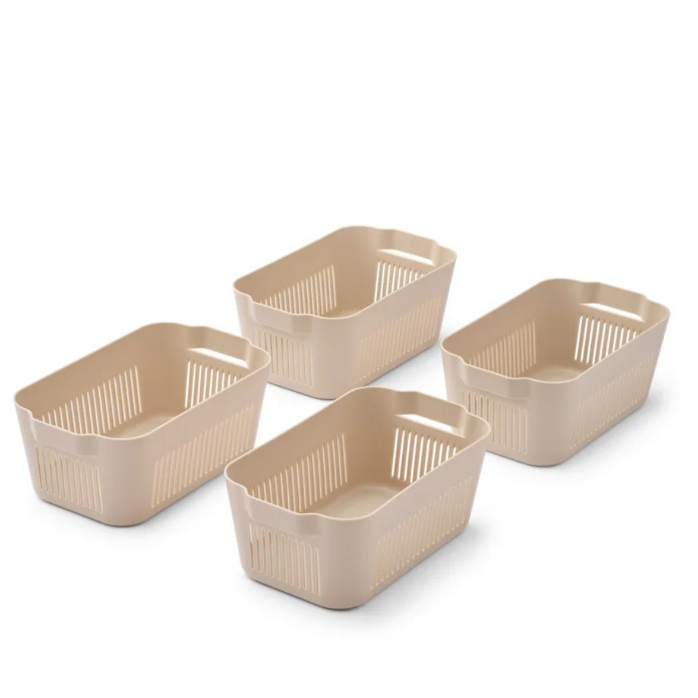 De fire minikurve har praktiske håndtag, er lette og kan stables, når de er tomme.