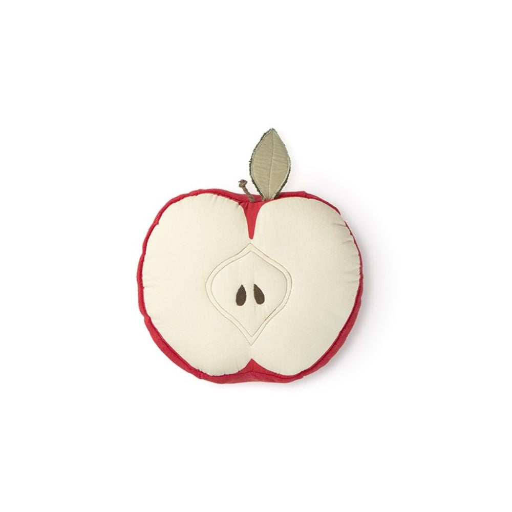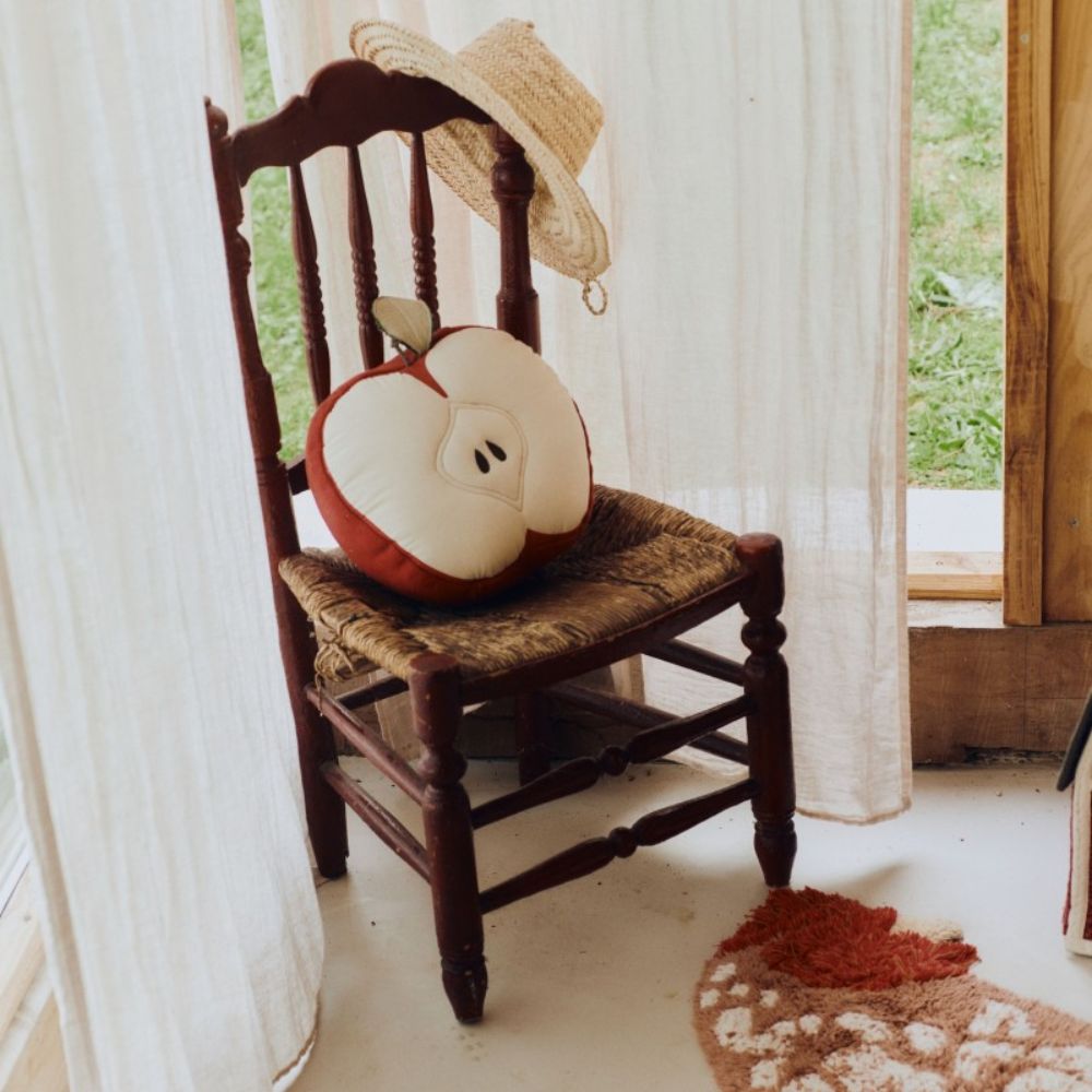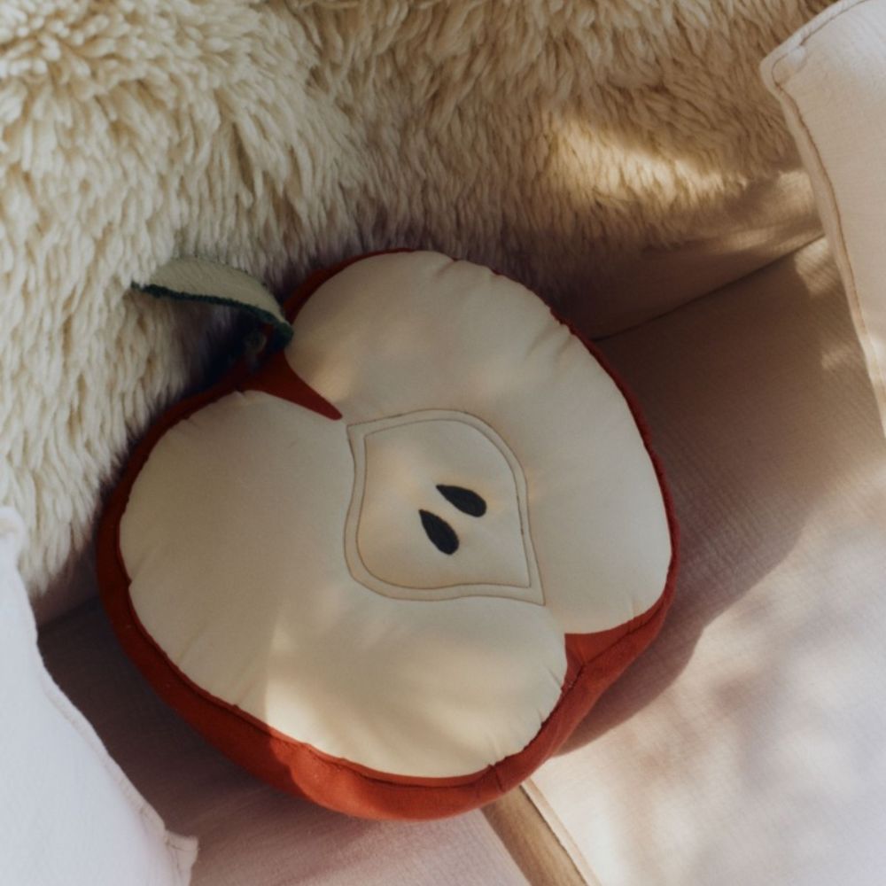 Puden er lavet af bomuld og har form som en halv æble med et lille blad på toppen, hvilket giver interiøret et naturligt og muntert touch.