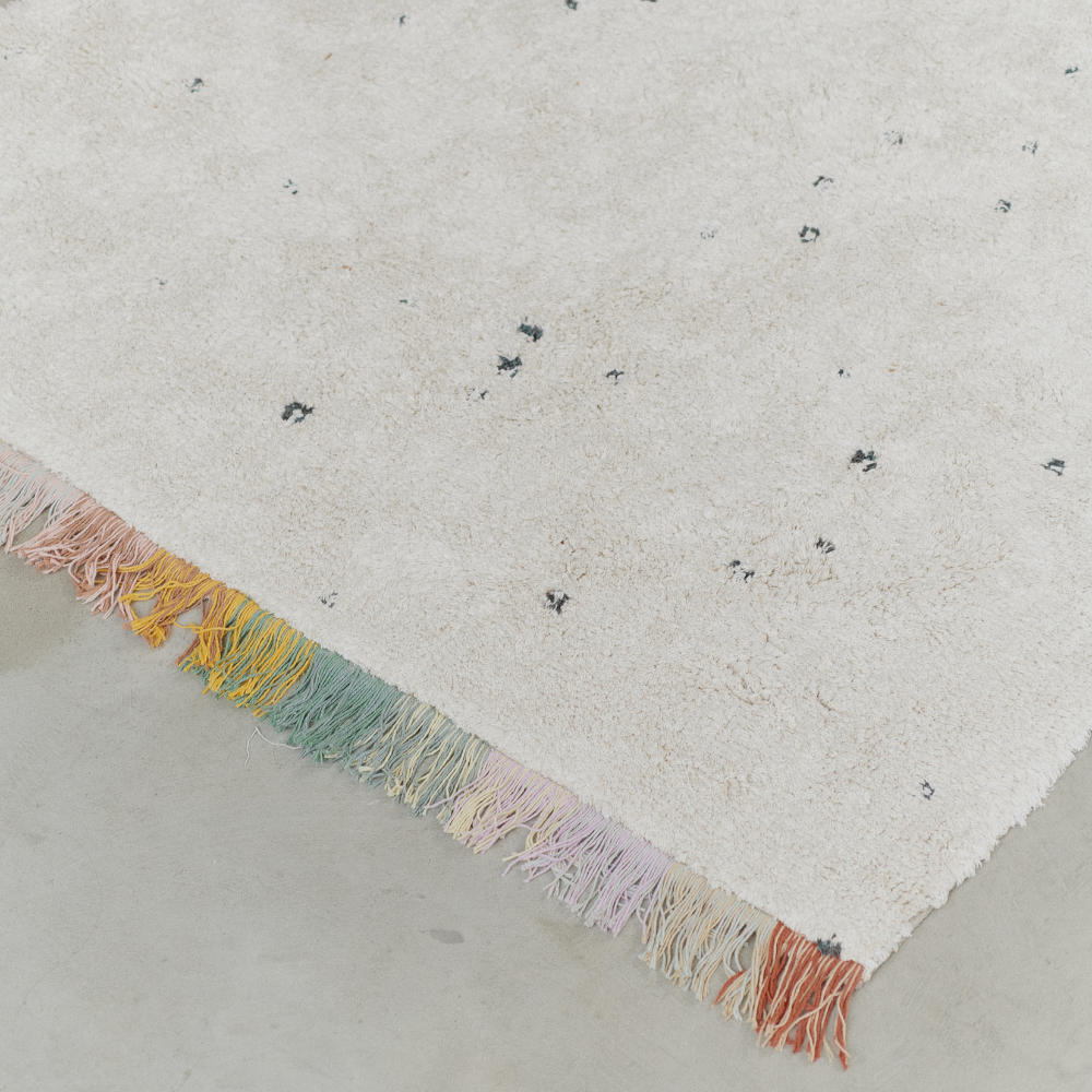 Det er håndlavet af naturlig bomuld, og den subtile lyse nuance er varieret med mørke prikker, der minder om stjernestøv.
