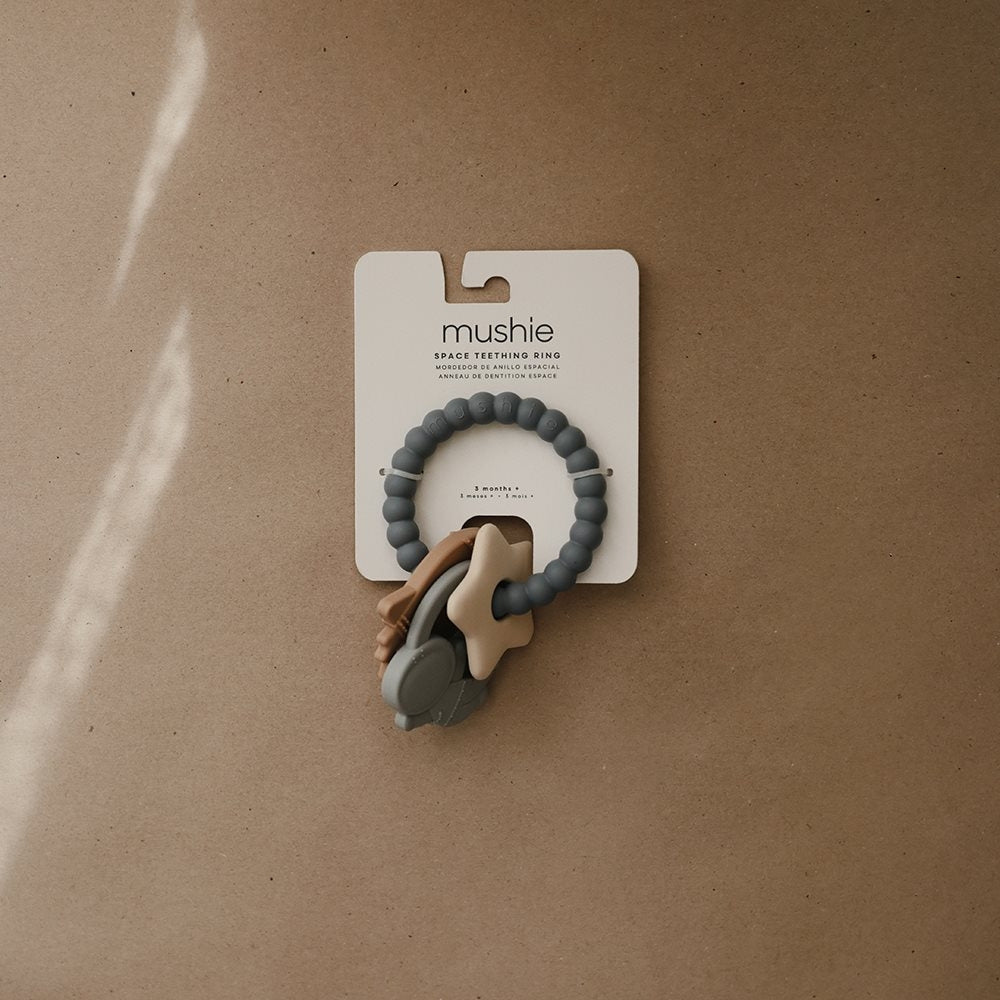 Space silikone ring-bidring fra Mushie vil helt sikkert falde i god smag hos alle små børn.