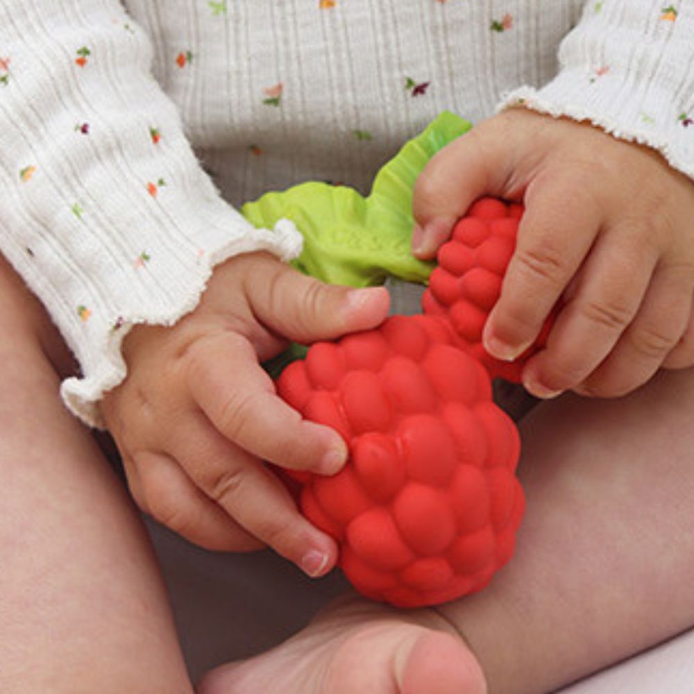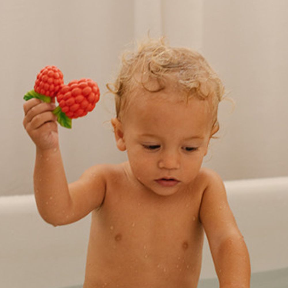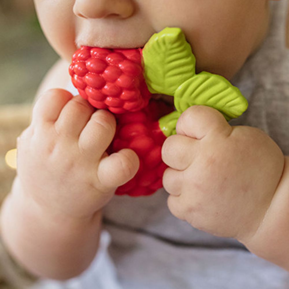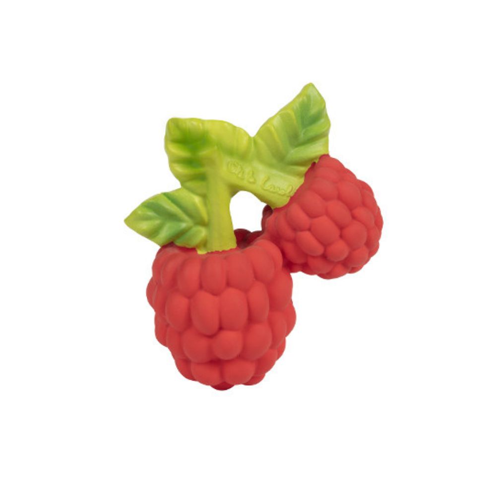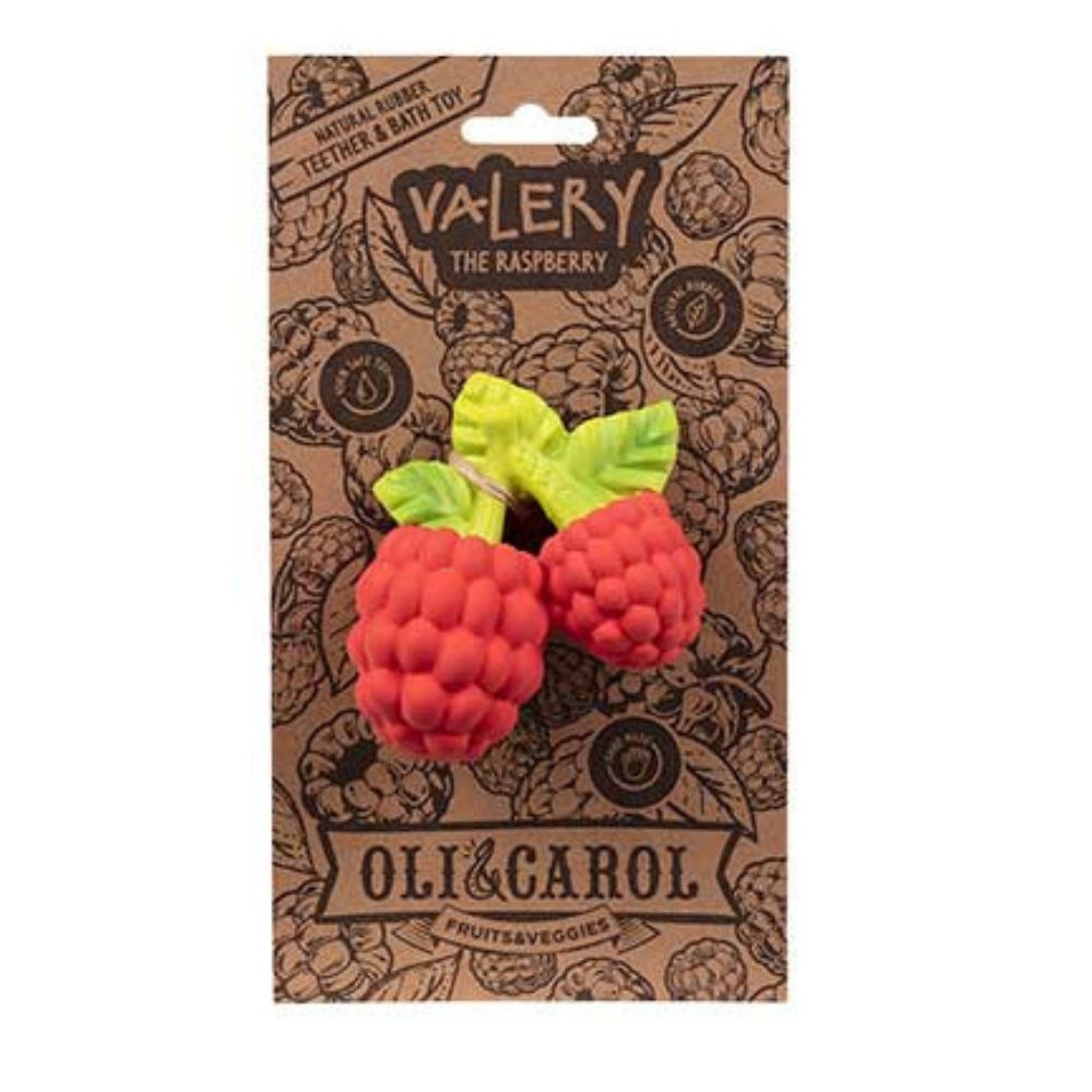 Valery Raspberry Baby Teether fra Oli&Carol af naturgummi er en perfekt designet bidering, der blidt masserer barnets gummer og støtter en sund udvikling.