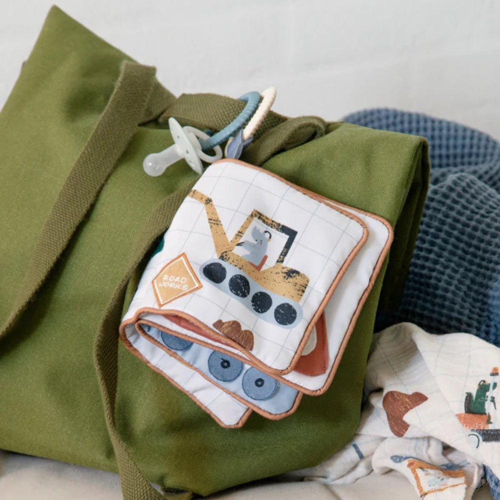 Babybogen har 8 bløde sider med Busy Builders-dyremotiver, der bygger deres konstruktionsverden og opmuntrer babyen til at interagere og udforske.