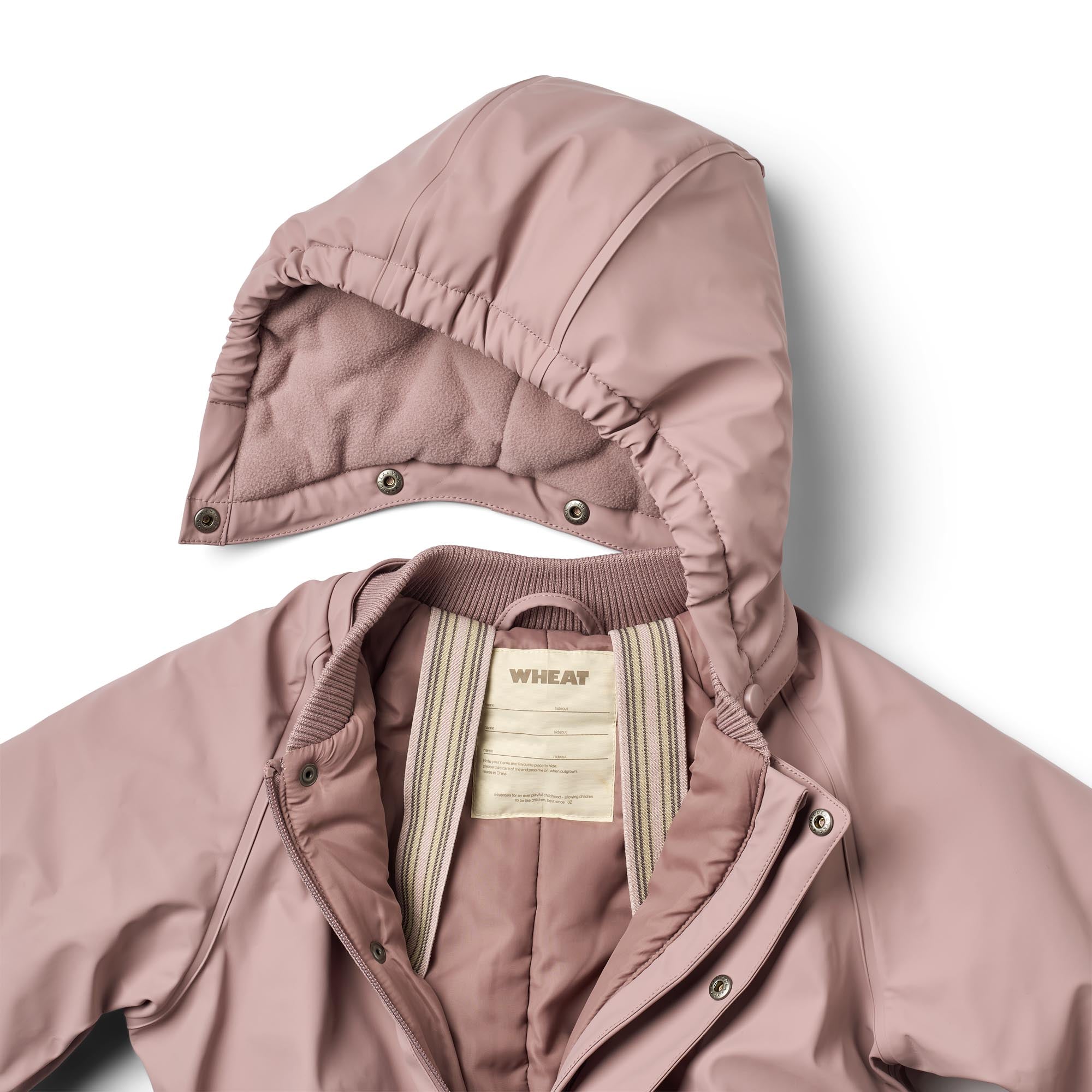 Wheat vinterdragten er også et bevidst valg – den er fremstillet af genanvendt polyester, fri for skadelige PFC'er og fluor, og den er Oeko-Tex-certificeret, hvilket bekræfter, at den er sikker for børns hud.
