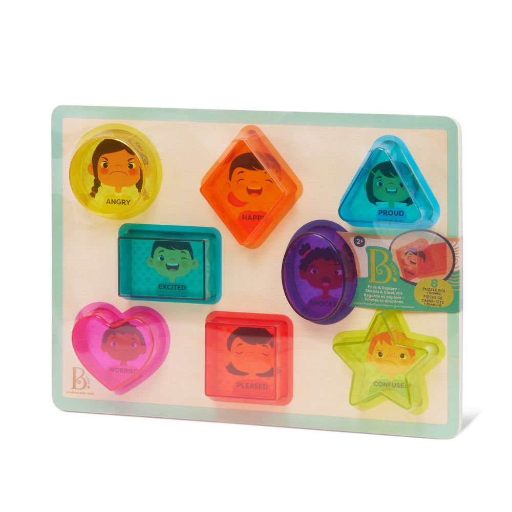 Træpuslespil til børn med former og følelser fra B.Toys.