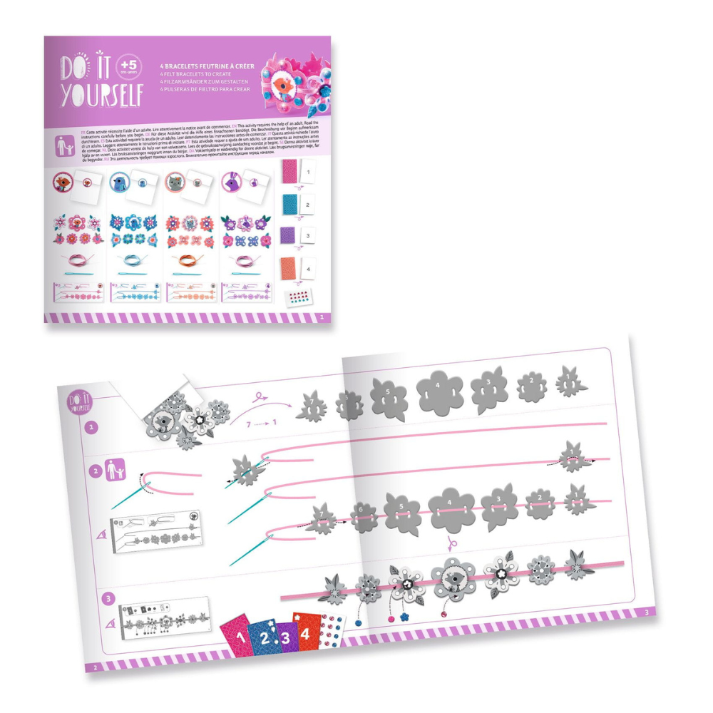 I æsken finder du alt, hvad du skal bruge for at lave 4 smukke venskabsarmbånd: blødt filt, skinnende skumstickers og stickers i form af farverige "småsten".