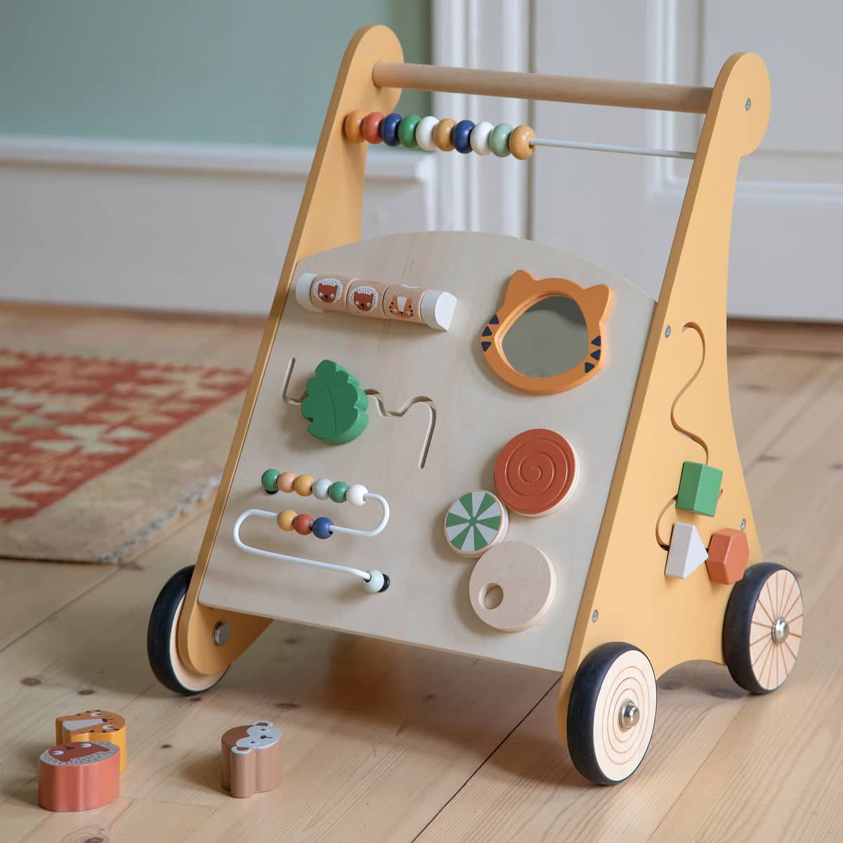 Den har en abacus, ruller, spejl, formsorterer og mange andre elementer, der udvikler babyens færdigheder og kreativitet.