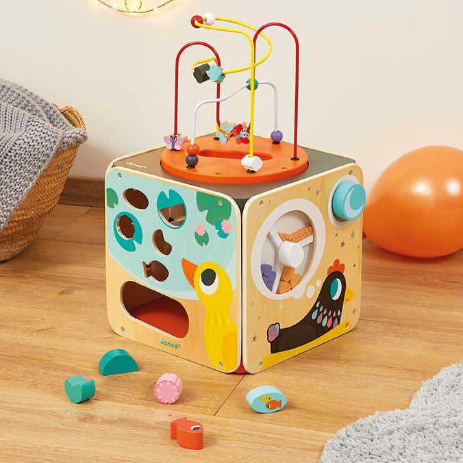 Den multifunktionelle læringskube med løkke fra JANOD er et unikt legetøj til børn fra 18 måneder.