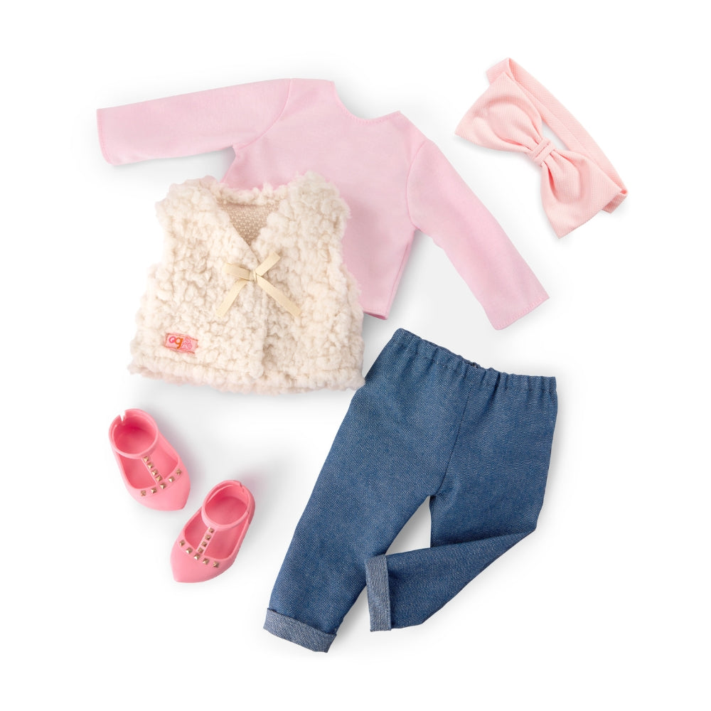 Hendes moderigtige tøj, der består af en pelsvest, plysdetaljer og et sødt hårbånd med en stor sløjfe, gør Our Generation-børnedukken til et blikfang og inspirerer til at skabe fantastiske historier.