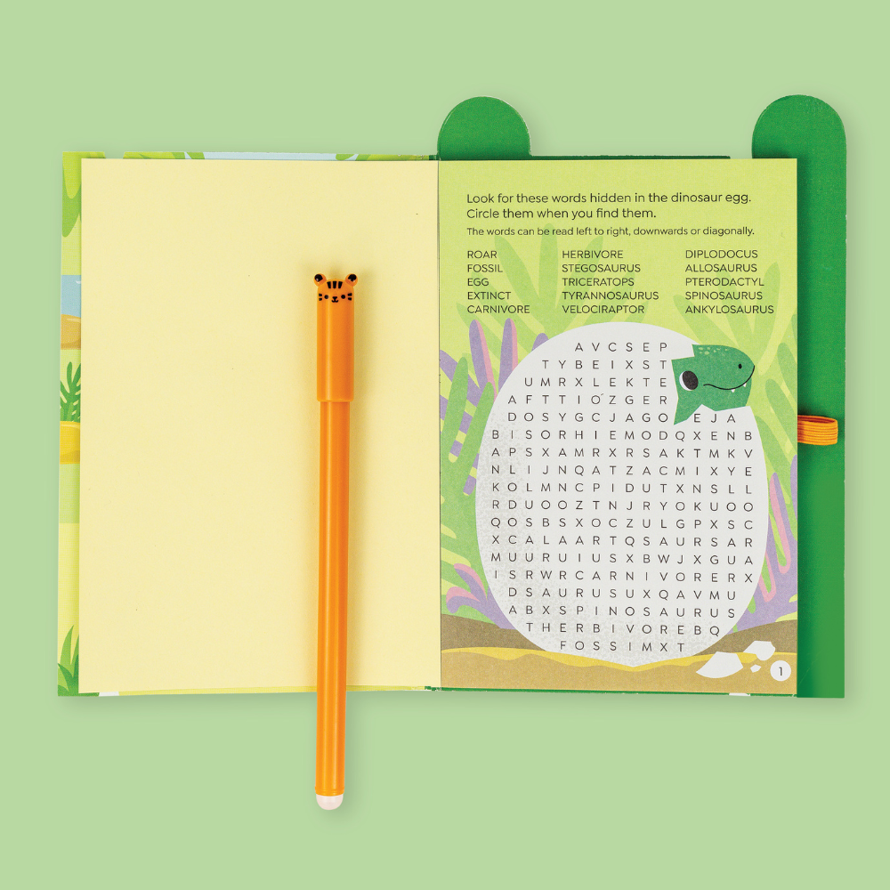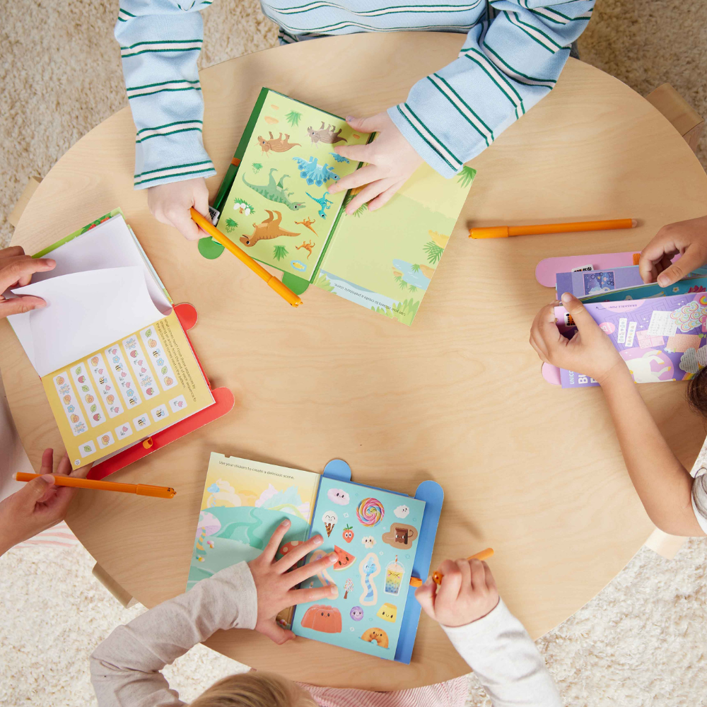 Sættet indeholder 25 sider med forskellige aktiviteter, et ark med klistermærker og en sletbar tuschpen – det perfekte sæt til endeløs kreativ leg.
