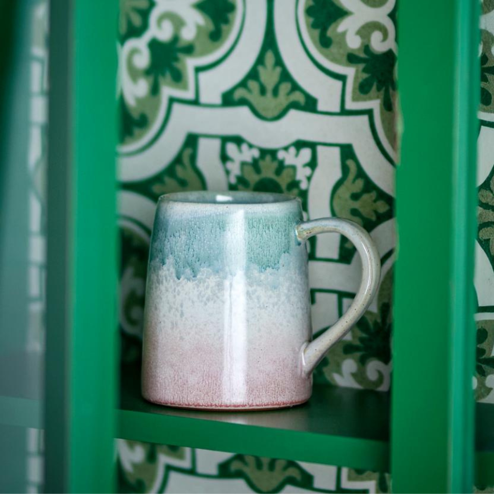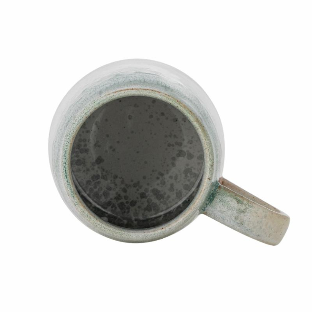 Dette sæt stentøjs krus imponerer med sin reaktive glasur – på hvert stykke er mønsteret og farveintensiteten arrangeret lidt forskelligt, hvilket gør hvert krus unikt.