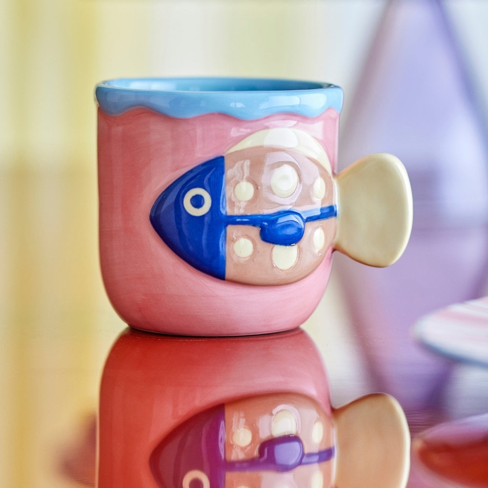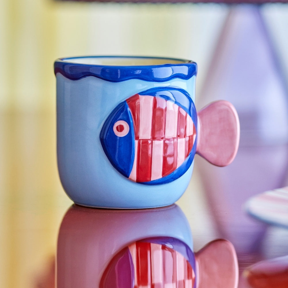 Det delikate prægede fiskemotiv og den håndmalede finish i bløde, flerfarvede toner gør hver krus unik og iøjnefaldende. Det er det perfekte valg til din morgenkaffe, te eller kakao.