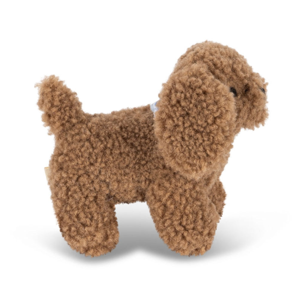 Konges Slojd-mærket præsenterer en sød plys hund med en blød klokke indeni, der afgiver en beroligende raslelyd, når man leger med den.