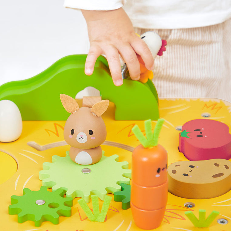 Der er blandt andet 8 forskellige aktiviteter, en løkke med perler, der kan flyttes, en høne på en fjeder, en høne, der kan glide langs en skinne, et æg, der kan drejes, vindmøller, en pyramide-gulerod, der kan stables, eller former, der kan placeres i hullerne (sorteringslegetøj).