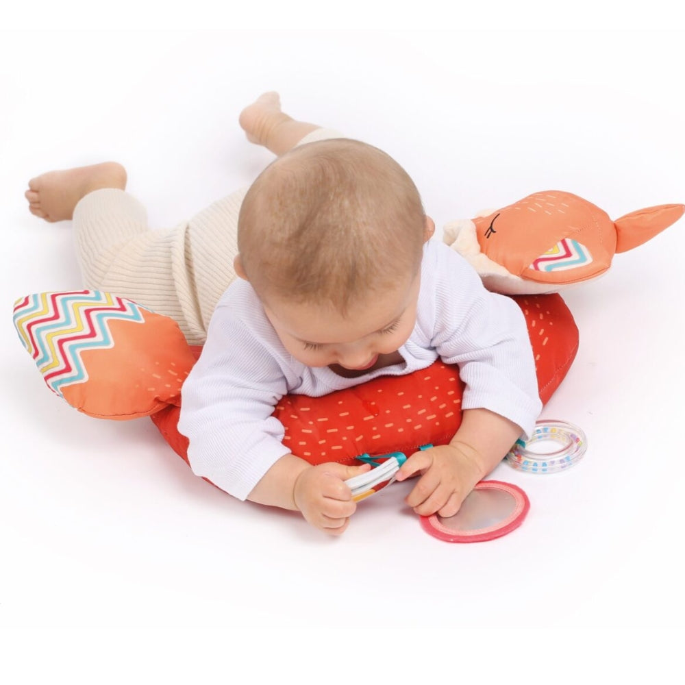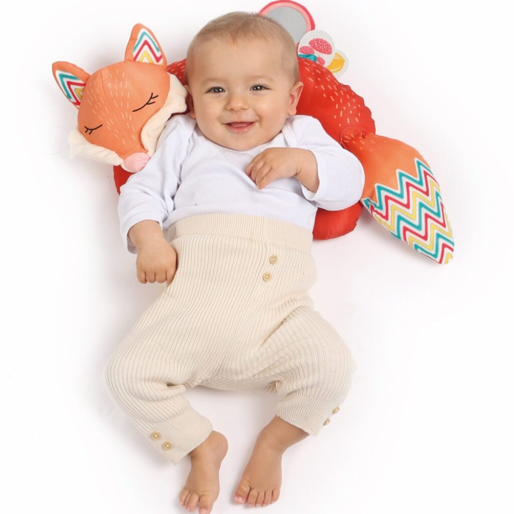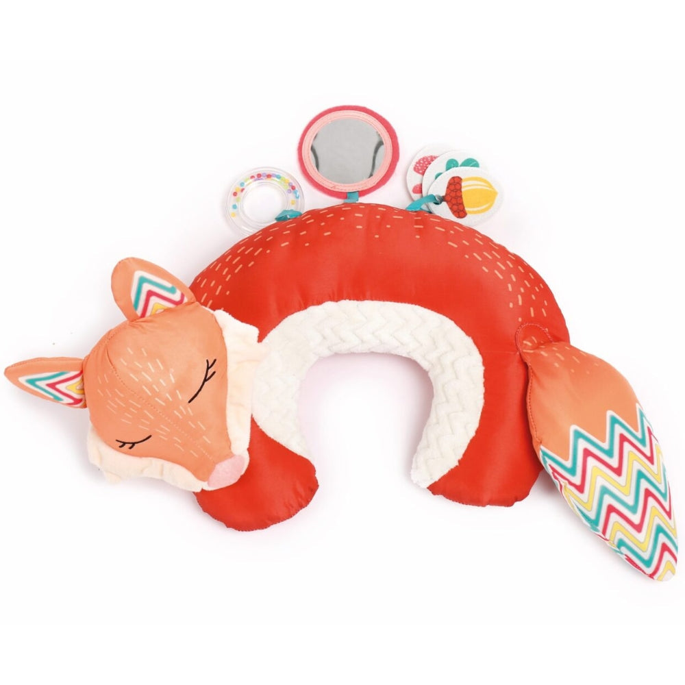 Denne aktiverende rævepude vokser med dit barn: den er velegnet både til babyens legetid og som en behagelig rejseunderstøttelse for et ældre barn.