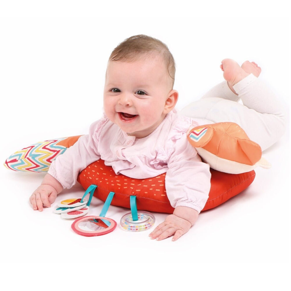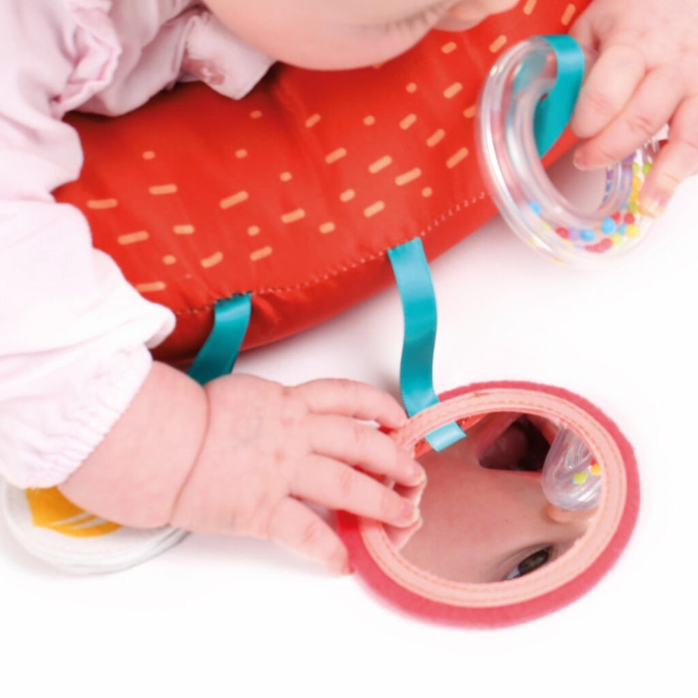 Med sine nøje udvalgte sensoriske elementer opmuntrer den babyen til at lege på maven, samtidig med at den stimulerer nakke- og rygmusklerne.