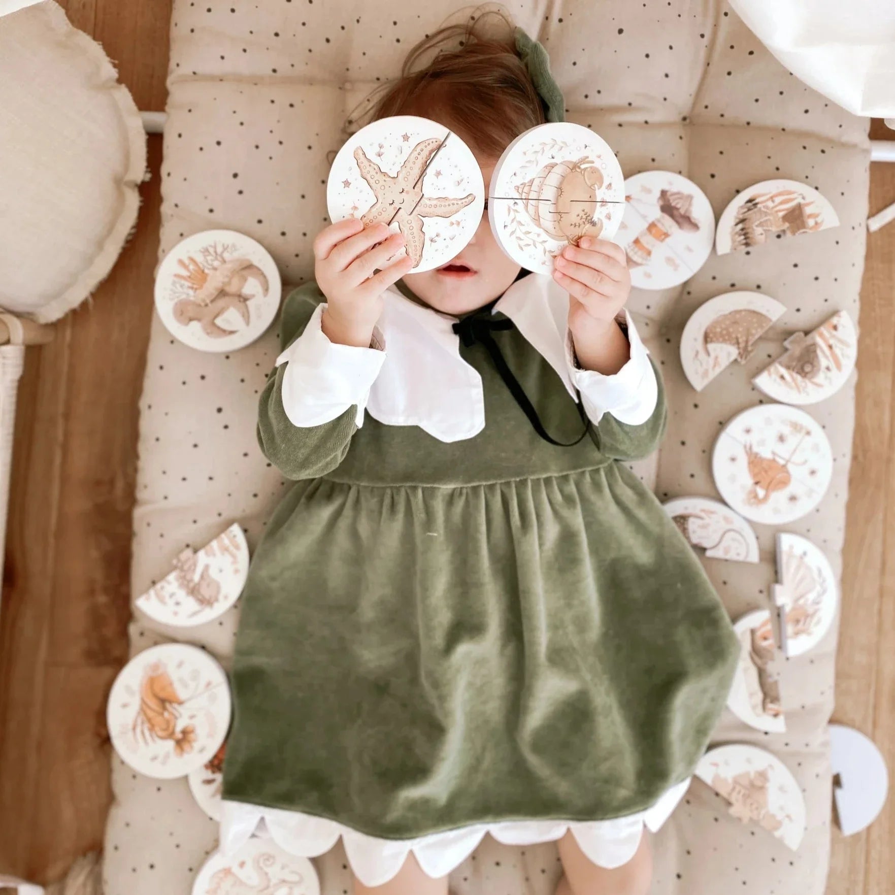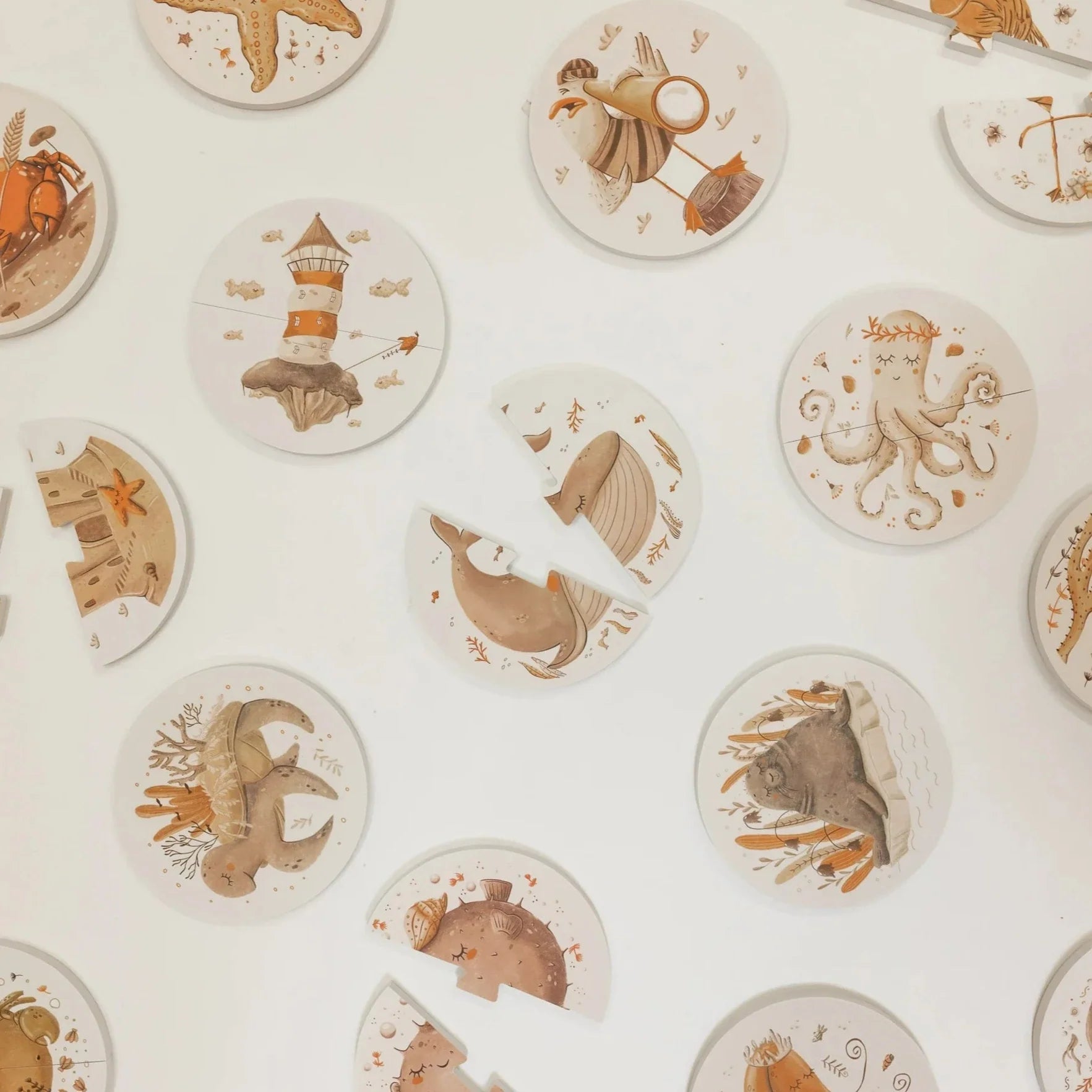 Et sæt med 20 puslespil med 2 brikker hver, så de små kan udforske og afdække havdyr.