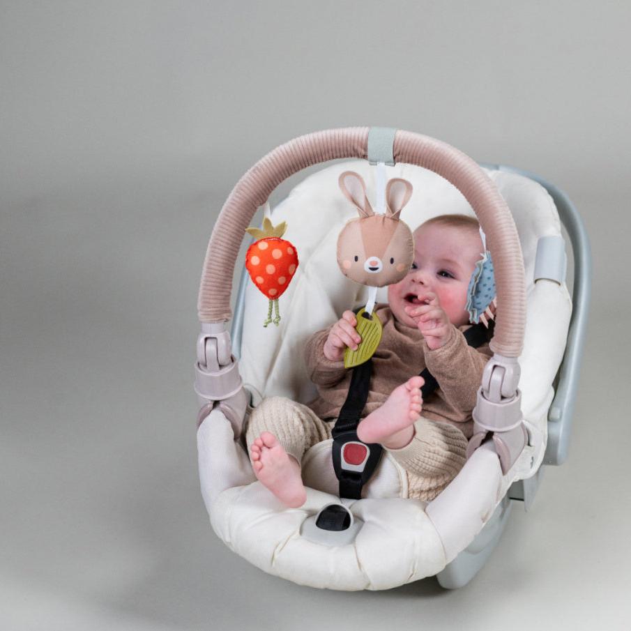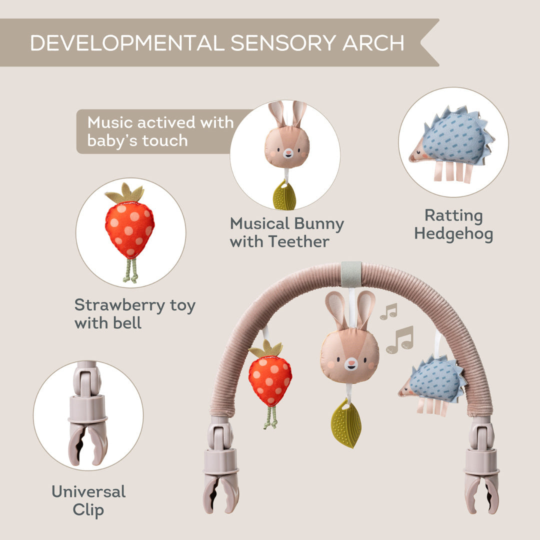 Klapvogns-hovedbånd fra Taf toys med fascinerende instrumentlegetøj, der stimulerer opdagelsen af lyde og hjælper med at udvikle babyens sanser og motoriske færdigheder.