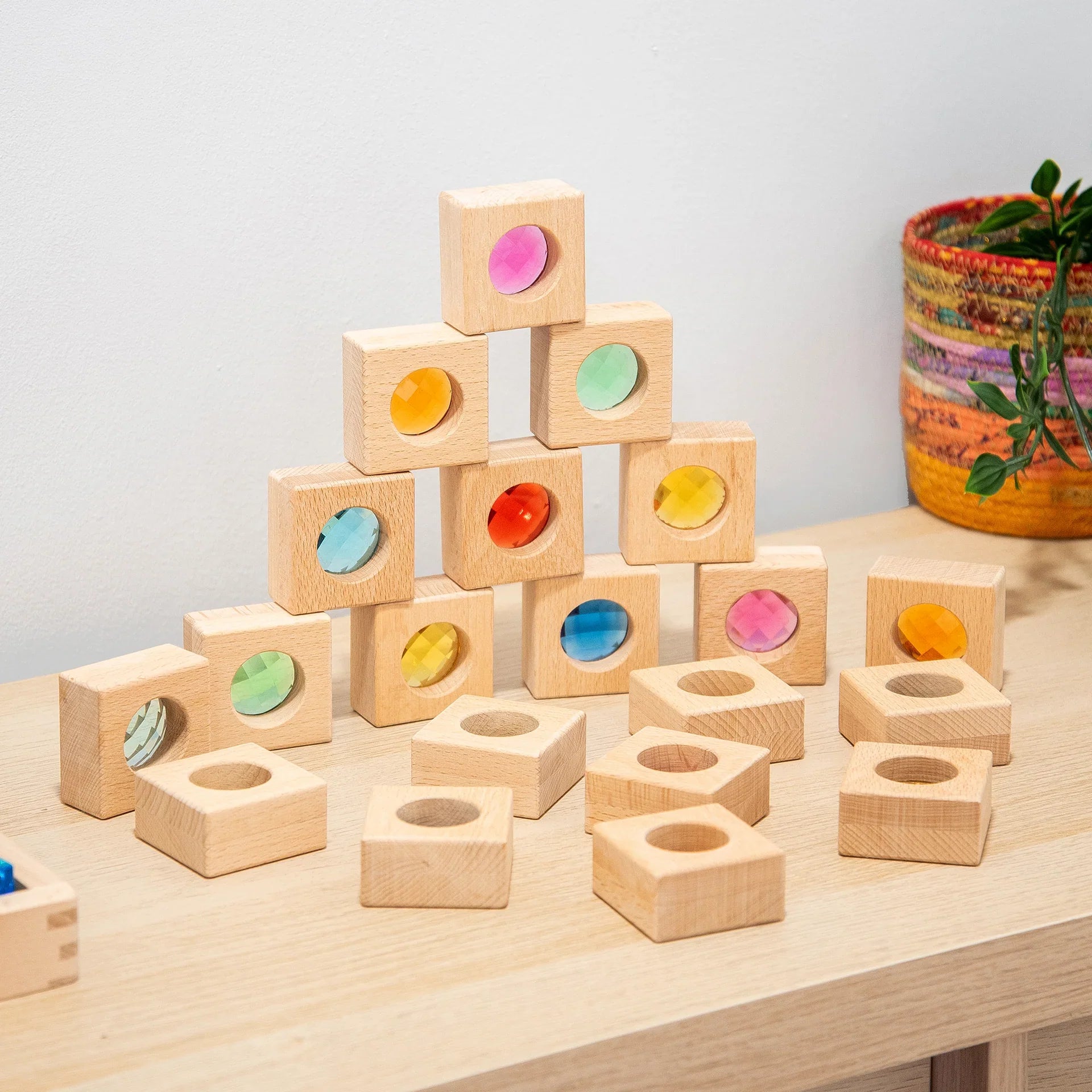 Kaleidoskopblokkene glæder med deres intense farver og giver mulighed for at observere de smukke mønstre, der skabes i lyset, hvilket udvikler nysgerrigheden og stimulerer fantasien.