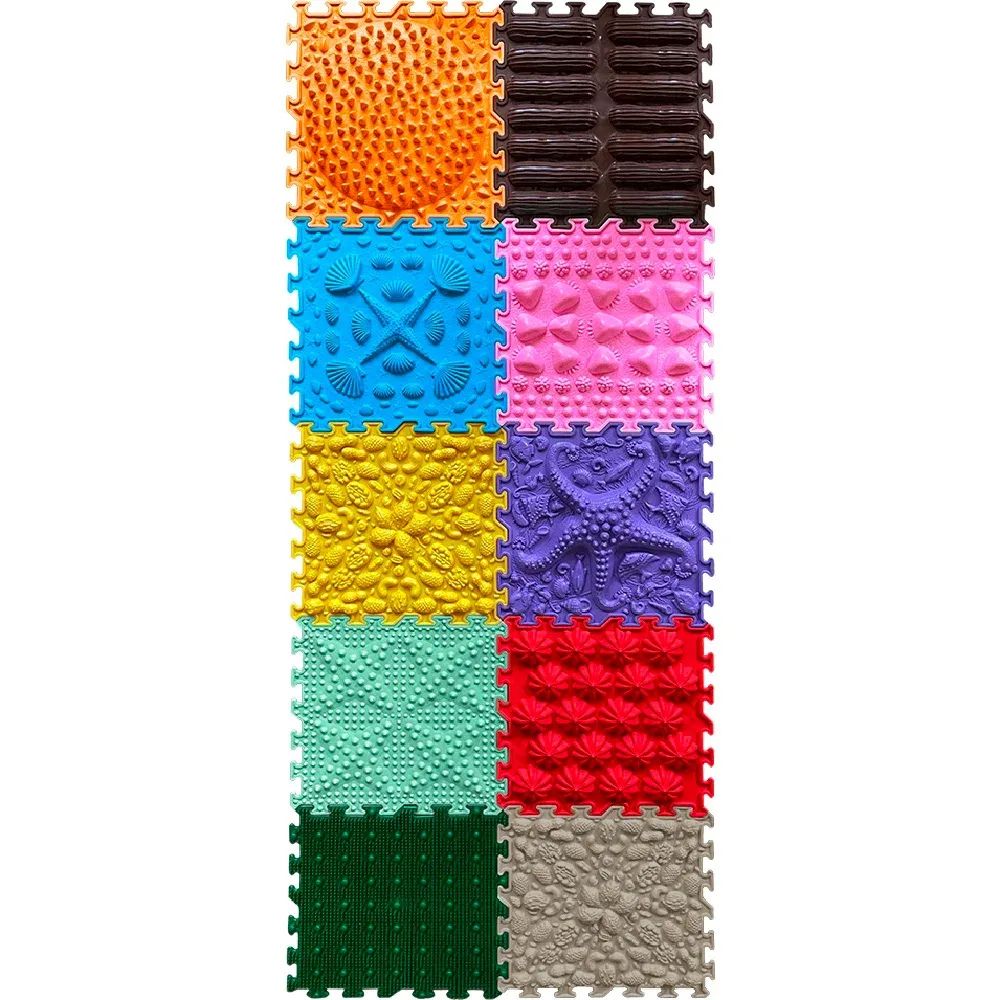 Den sensoriske måtte fra Ortonature tilbyder en bred vifte af teksturer og farver, der stimulerer fantasien, forbedrer blodcirkulationen, hjælper med at korrigere platfødder, fjerner hævelser i benene og understøtter det vestibulære system.