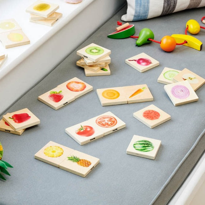 Hvert puslespilsbrik har et farverigt tryk på den ene side med en ægte frugt eller grøntsag.