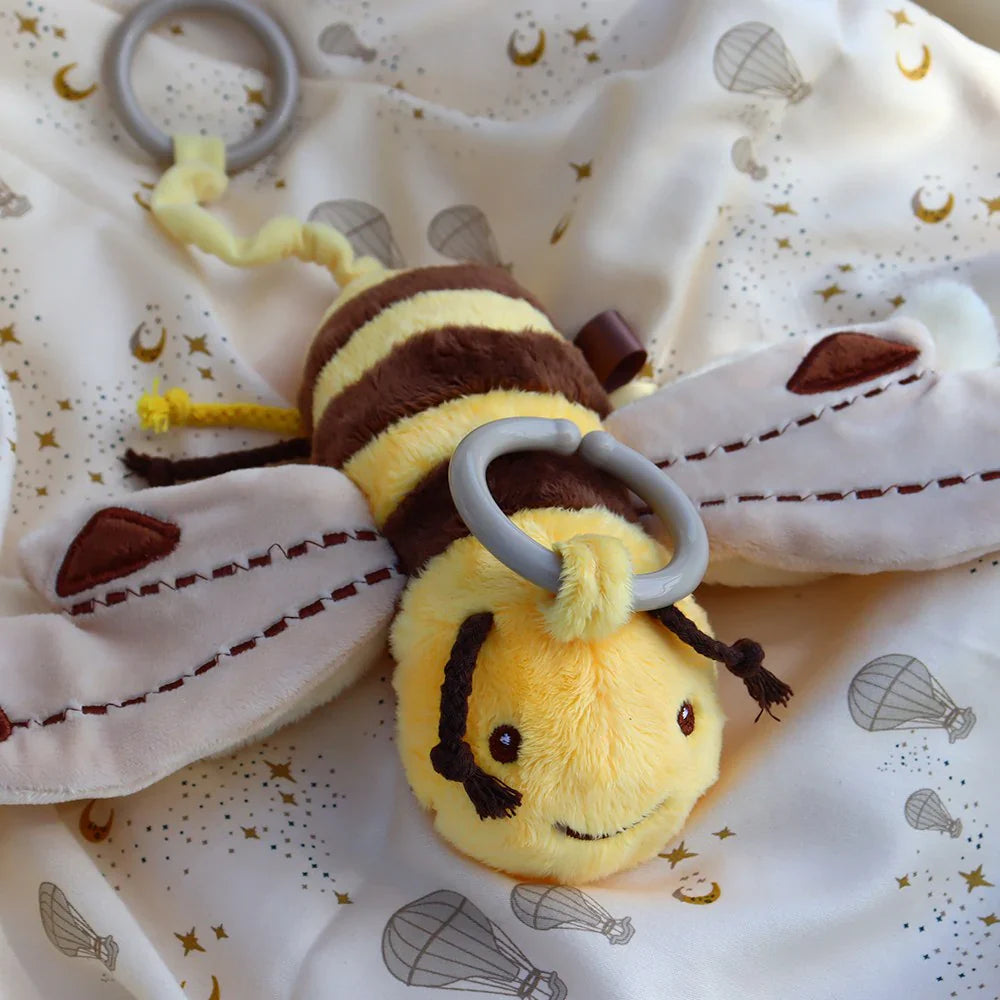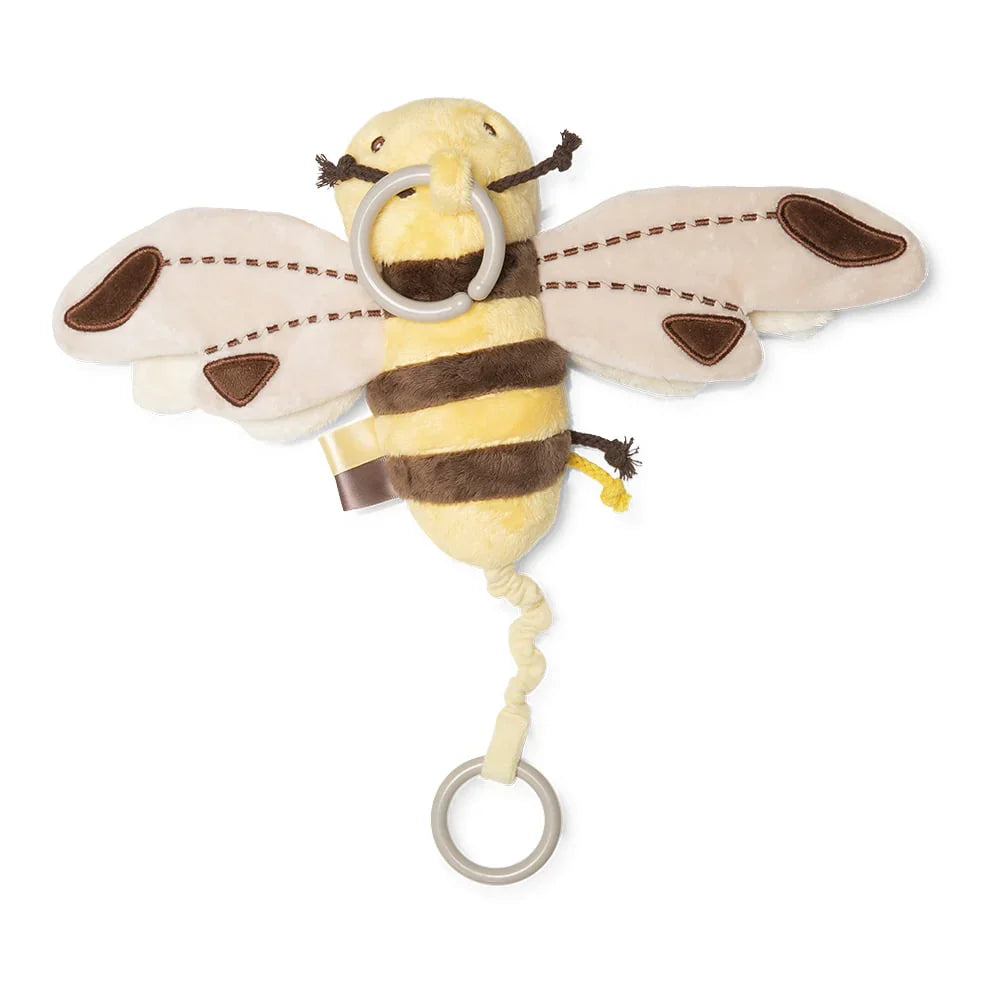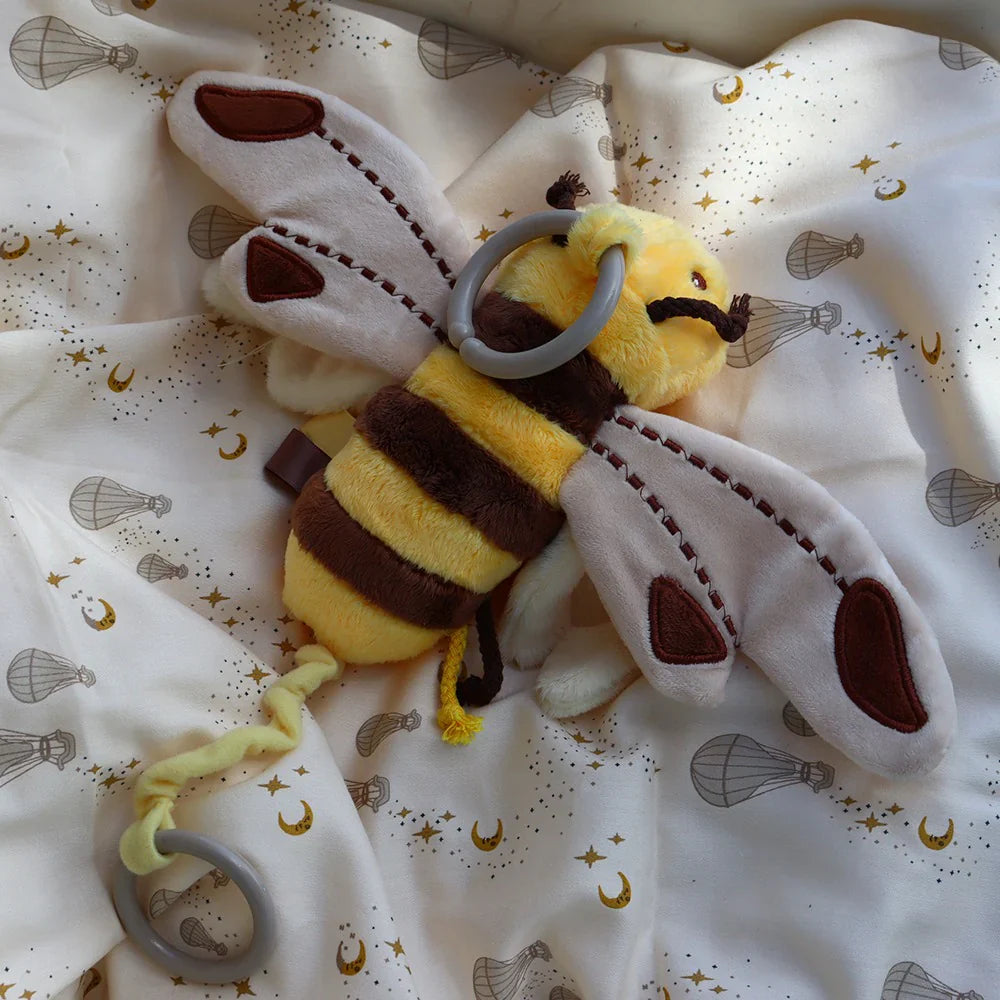 Derudover har barnevognsvedhænget en snor i bunden, som når den trækkes, får bien til at vibrere, hvilket giver babyen endnu mere sjov og sensorisk stimulation.