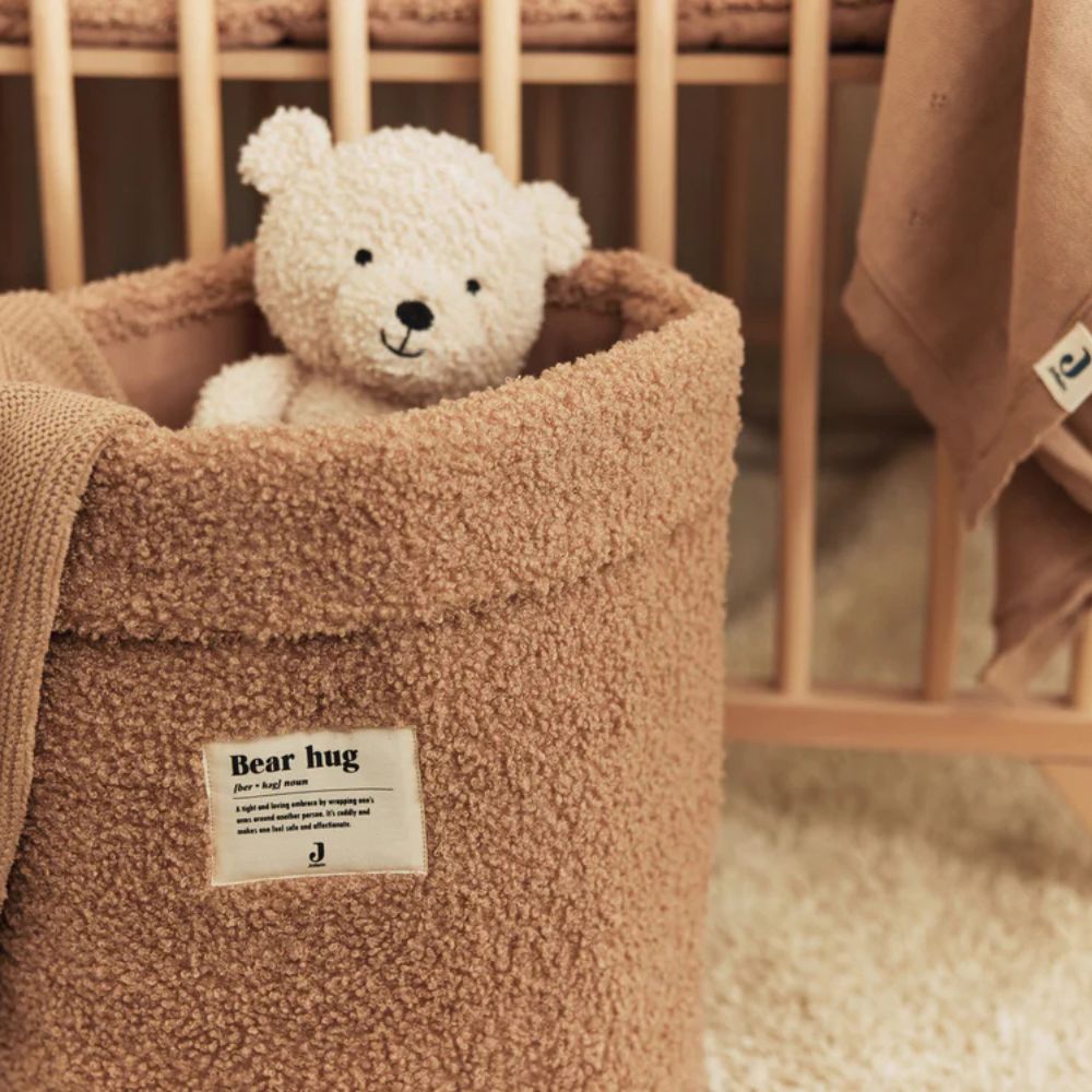 Teddybjørnen fås i to dæmpede farver – olivengrøn og vild rose – og vil være en smuk og funktionel tilføjelse til babyens garderobe.