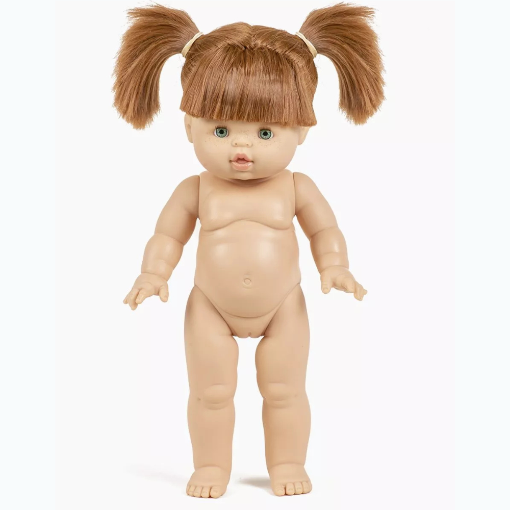 Hun har rødt hår sat op i søde hestehaler, grønne øjne og står stabilt takket være sine lige ben, så hun er nem at placere, når man leger hus eller børnehave.